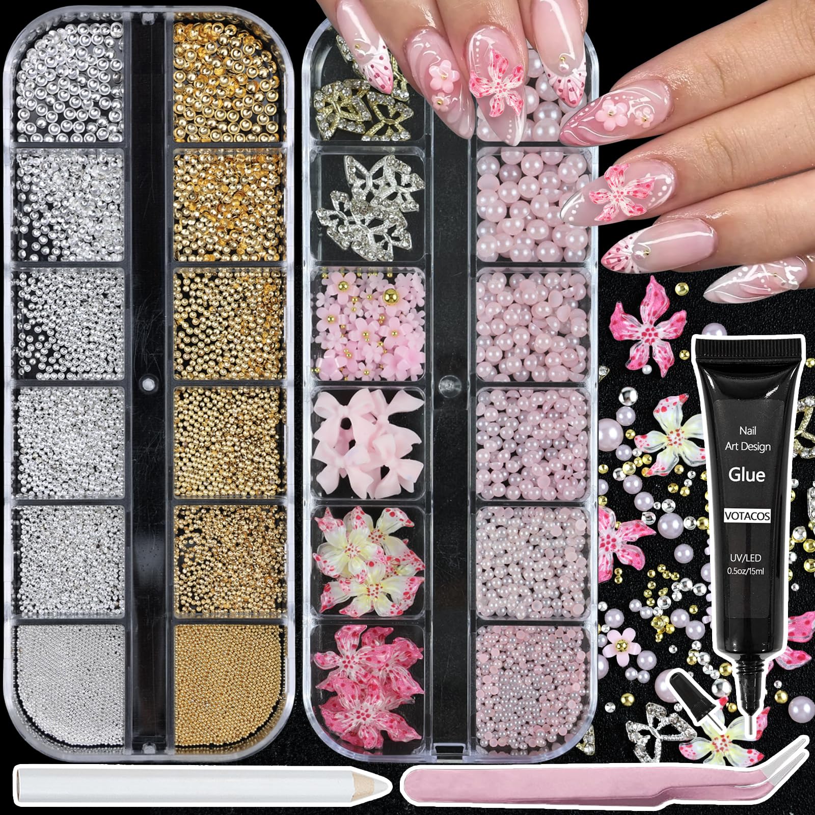 Abalorios para arte de uñas con diamantes de imitación, pegamento de gel rosa, perlas planas, lazo de flores, suministros de gemas