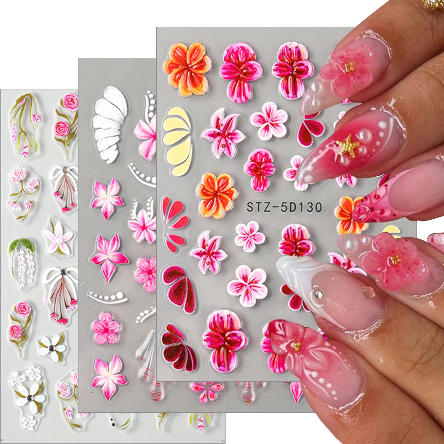 Calcomanías de uñas con pinzas, 4 hojas en relieve floral 5D, autoadhesivas para manicura de bricolaje
