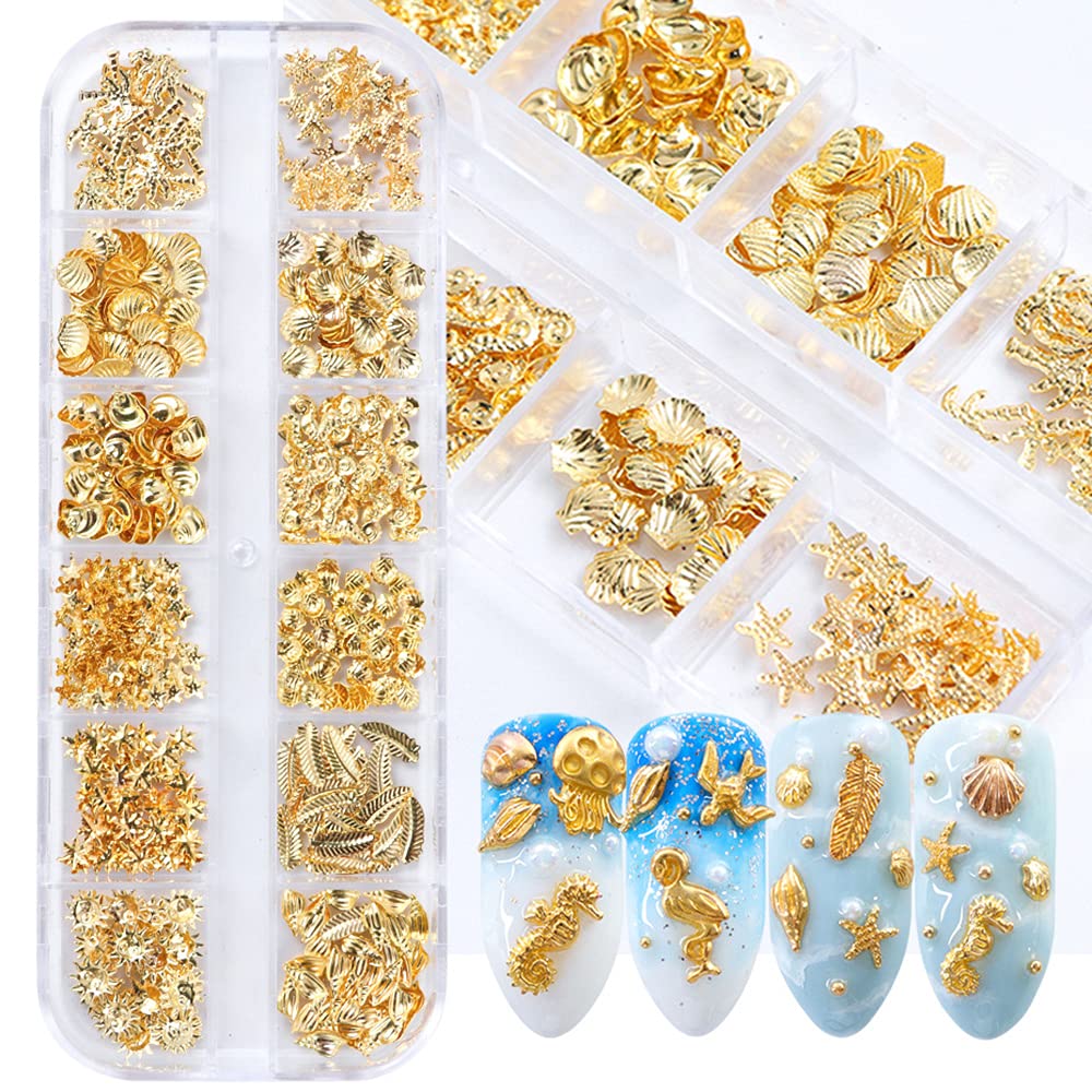 Calcomanías de metal 3D para uñas, 12 formas, purpurina holográfica y lentejuelas, kit de suministros de arte dorado, caballito de