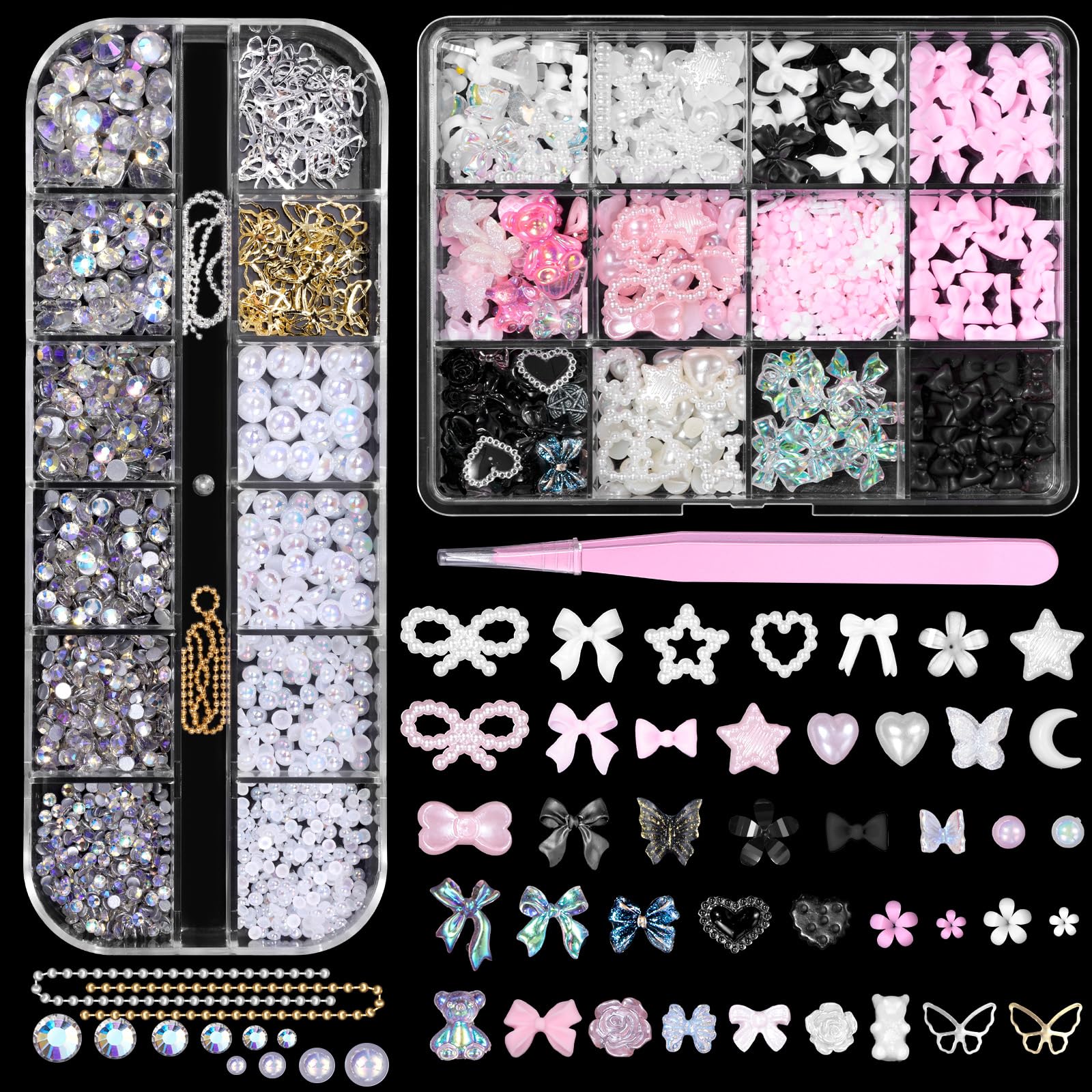 Encantos de uñas surtidos 3D, gemas, lazo, mariposa, flor, acrílico, arte de uñas, perlas de uñas medio redondas y dijes de rineto