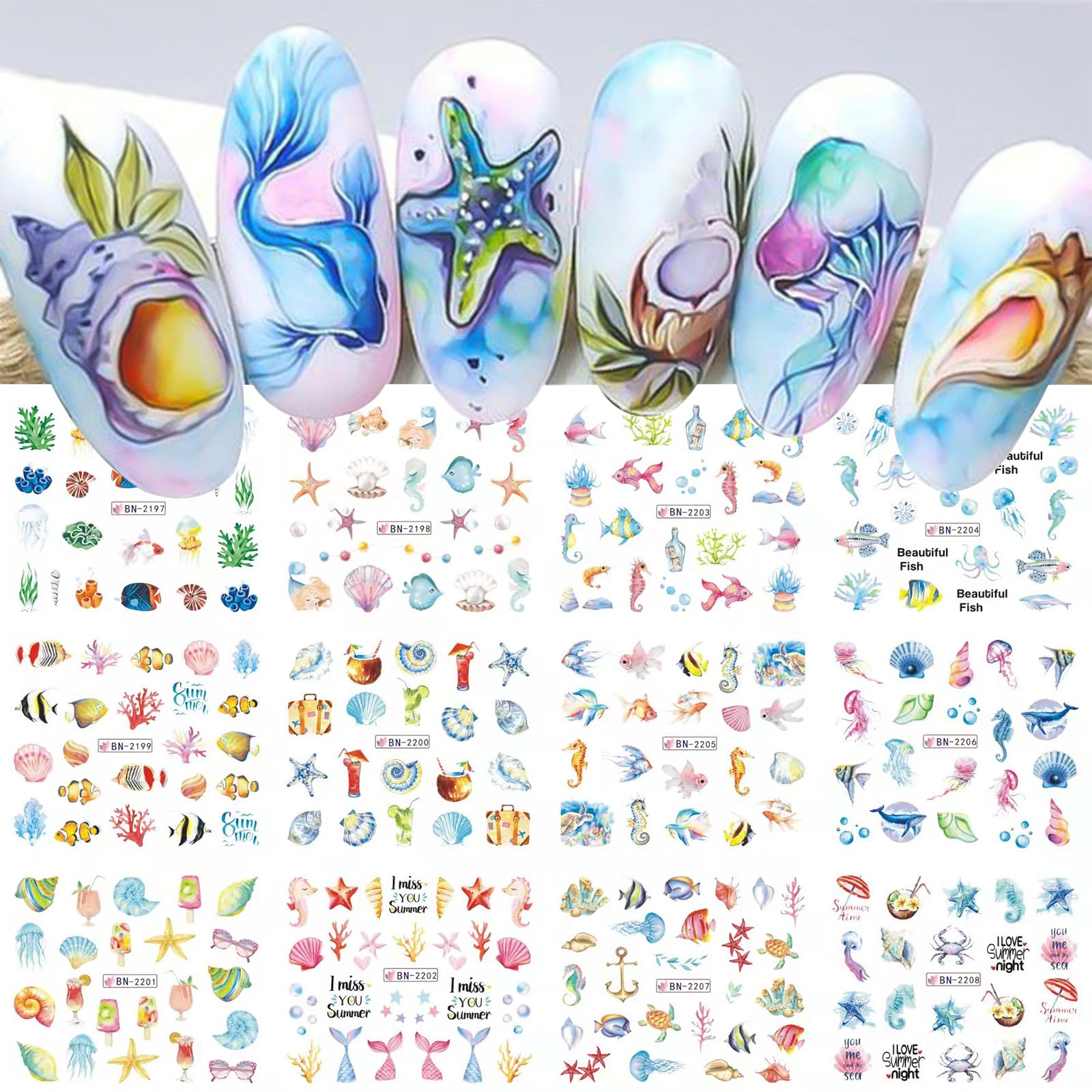 12 hojas de calcomanías de transferencia de agua para uñas de océano, criatura marina, concha de mar, medusas, tortugas marinas, c