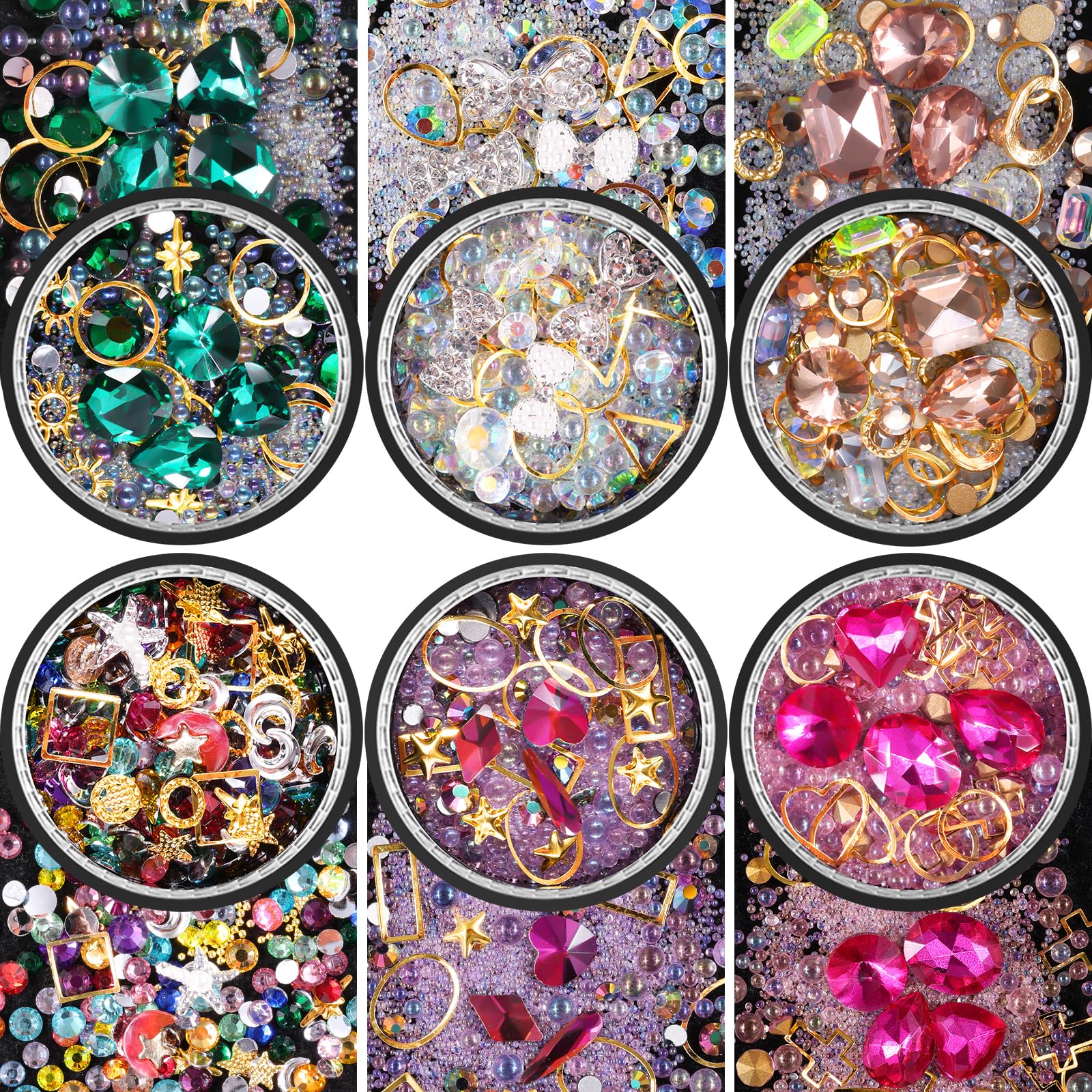 6 ruedas mixtas brillantes para arte de uñas, diamantes de imitación, cristales de mariposa, perlas artificiales, oro y plata, tac