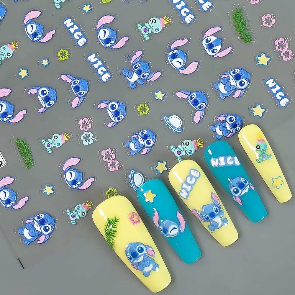 Cute 5D Emboss Nail Art Stickers Decals Blue Cartoon Self Adhesive Nail Stickers Design Cute Relief Little Monster Nail Decals for