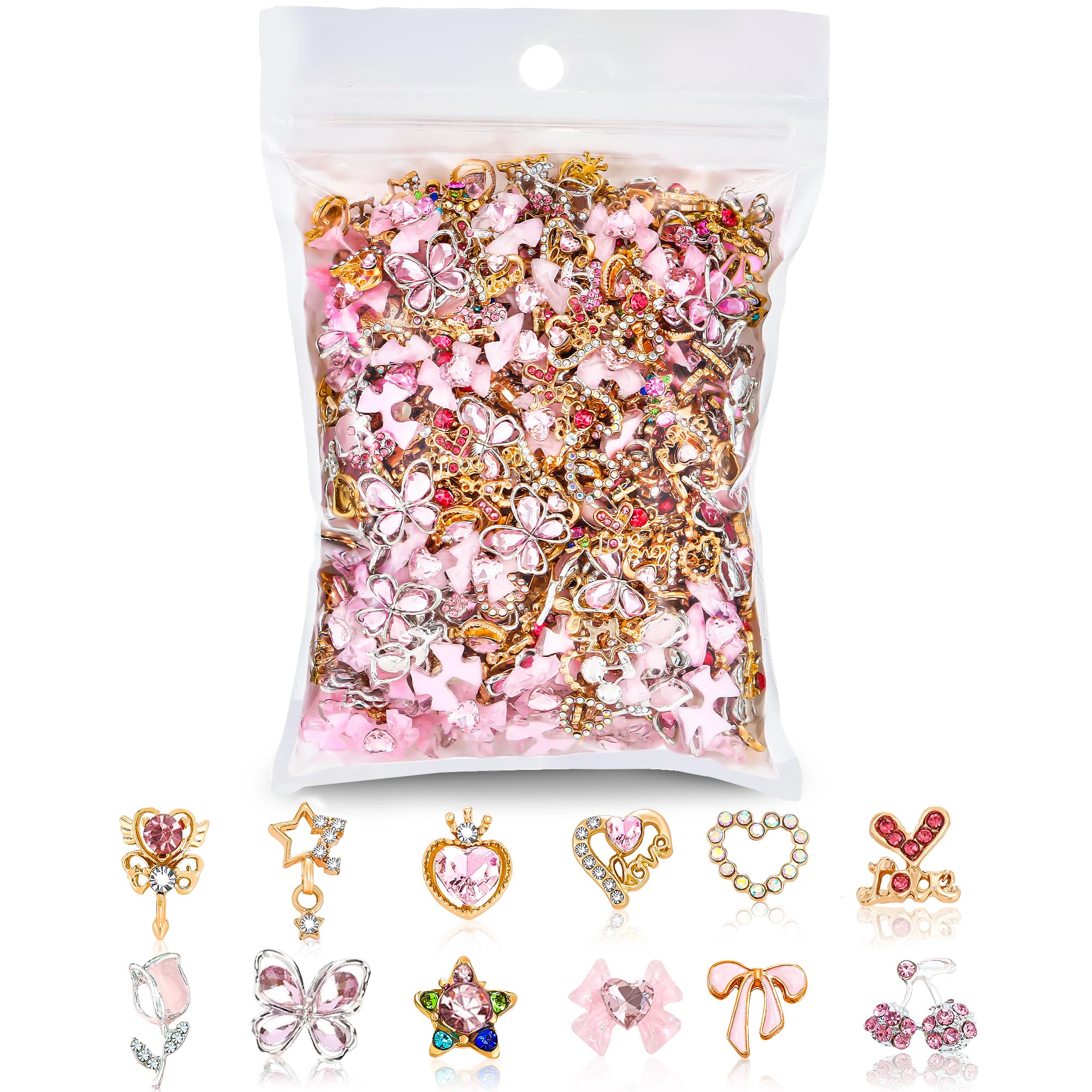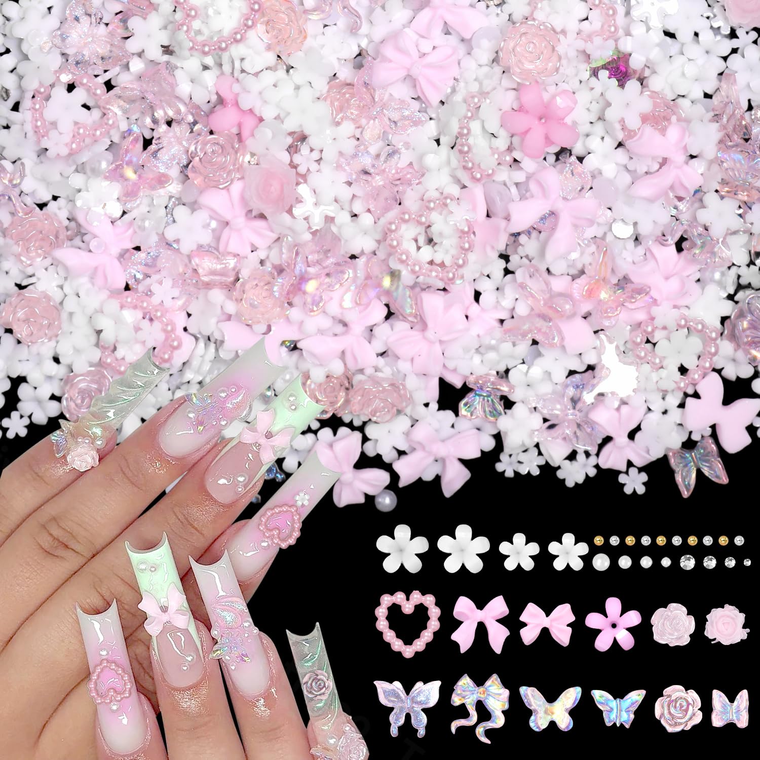 1000 dijes de flores blancas para uñas, dijes de flores pequeñas 3D para uñas acrílicas, lazos rosados mezclados, pétalos de marip