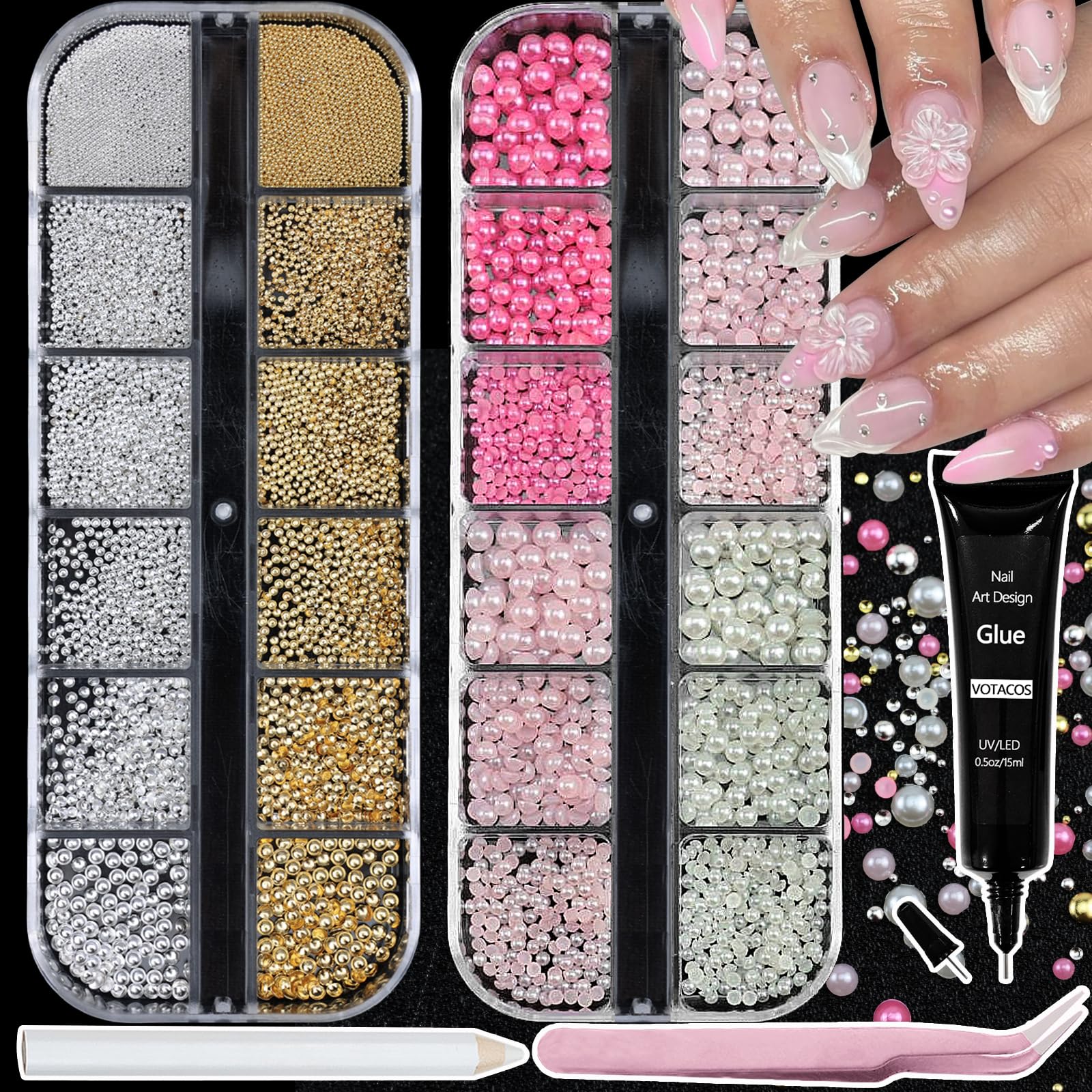 3 cajas de dijes de uñas y gemas para uñas, diseño de diamantes de imitación para uñas, cuentas de caviar, perlas