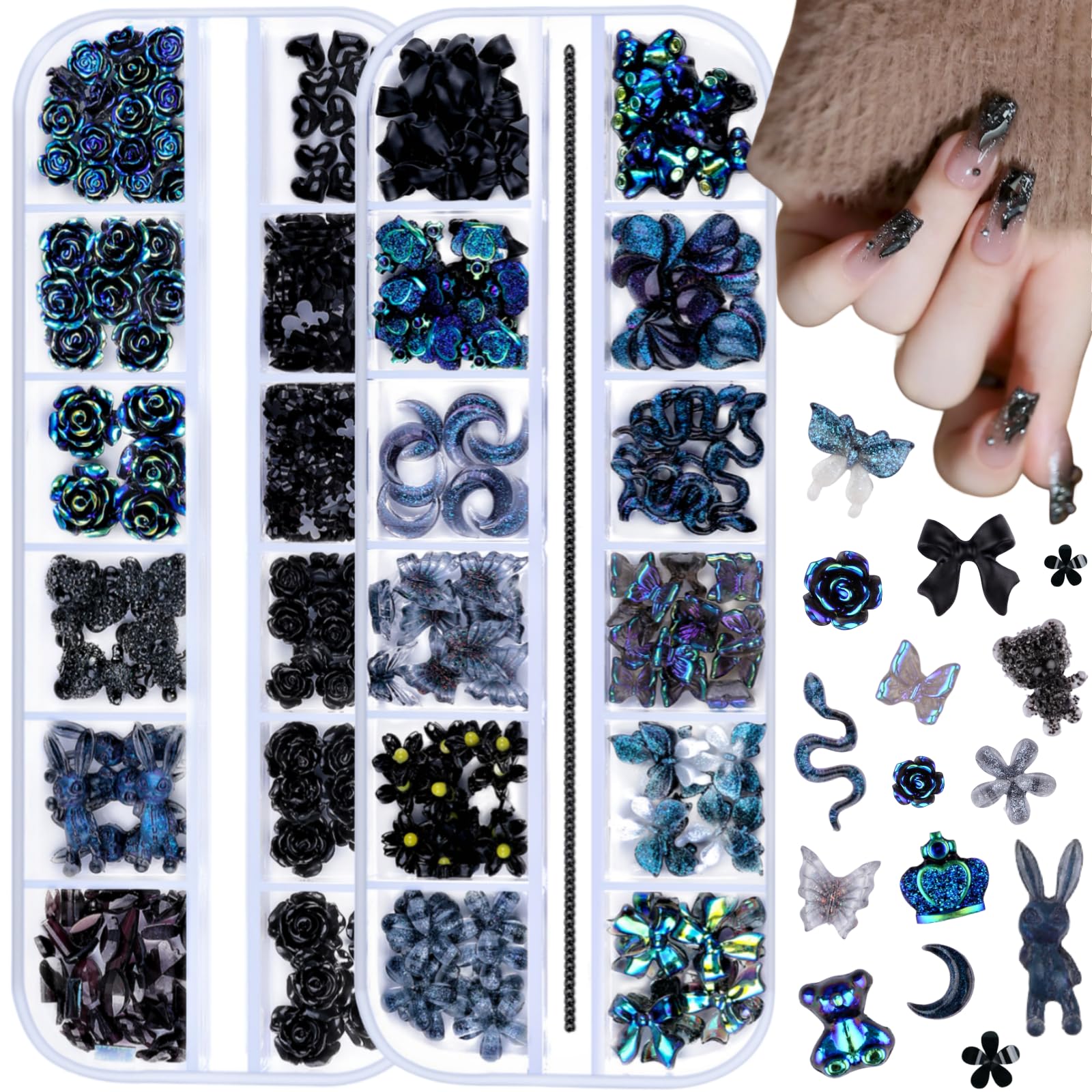 Juego de 2 cajas de dijes mixtos 3D para arte de uñas, resina grande, camelia rosa, mini flor, mariposa, arco, luna, corazón, estr