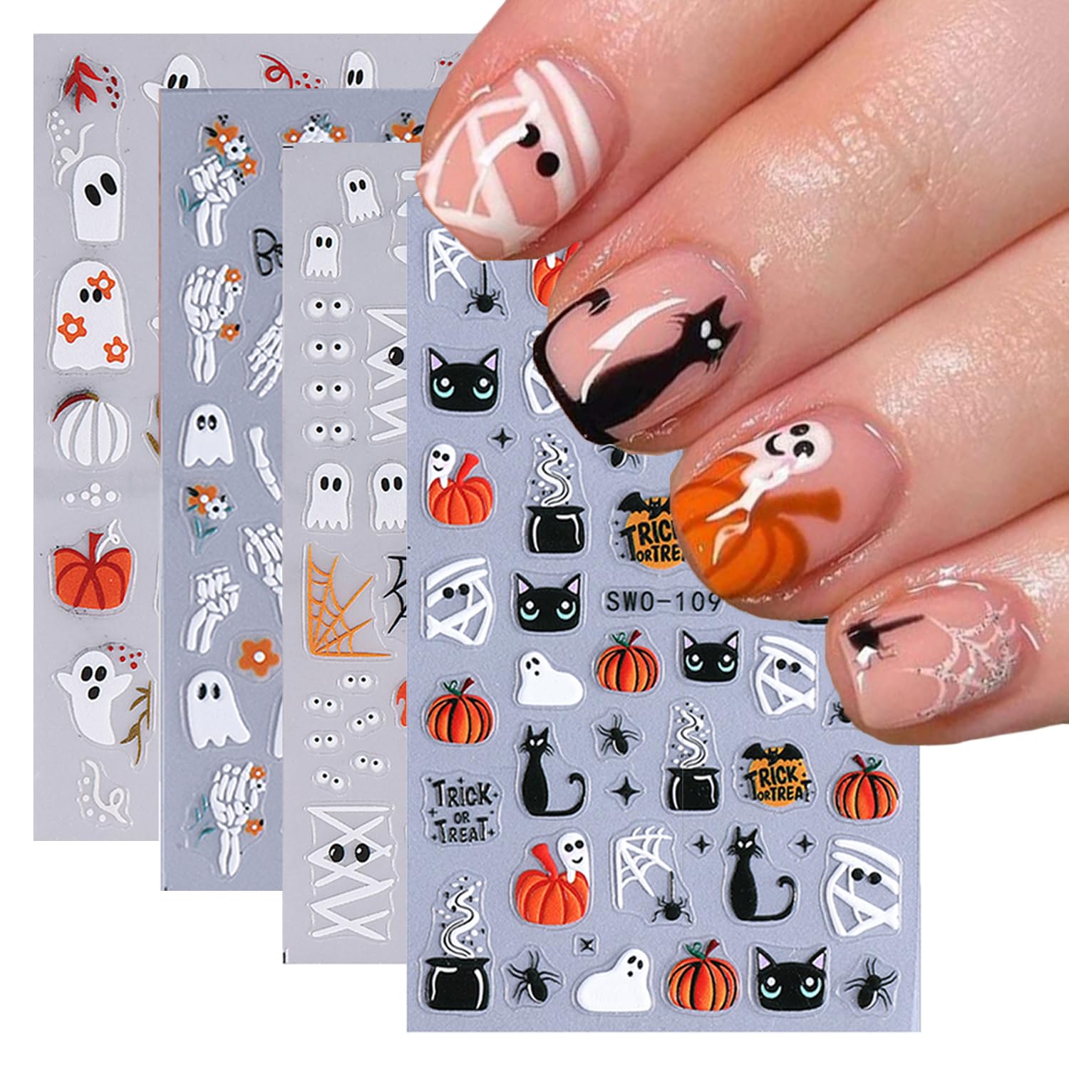 4 Sheets Halloween Nail Art Stickers Self-Adhesive Cute Little Ghost & Black Cat Designs Cartoon Bat DIY Spider Web Nail Art Decal