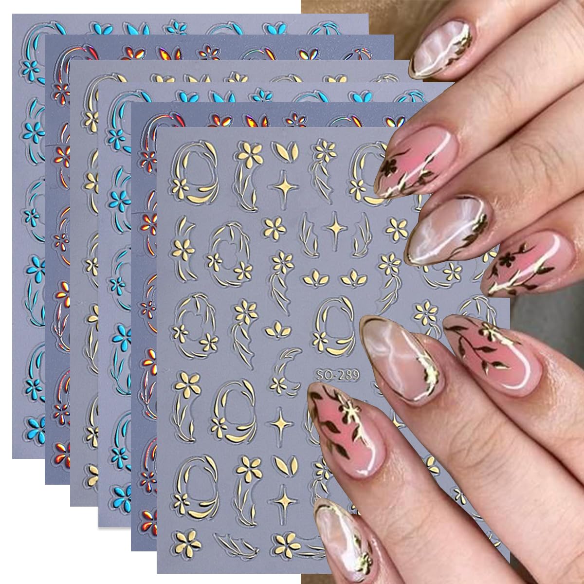 Calcomanías de uñas de flores, calcomanías de uñas de estrella, 3D, autoadhesivas, dorado, azul, degradado, láser, diseño de pétal