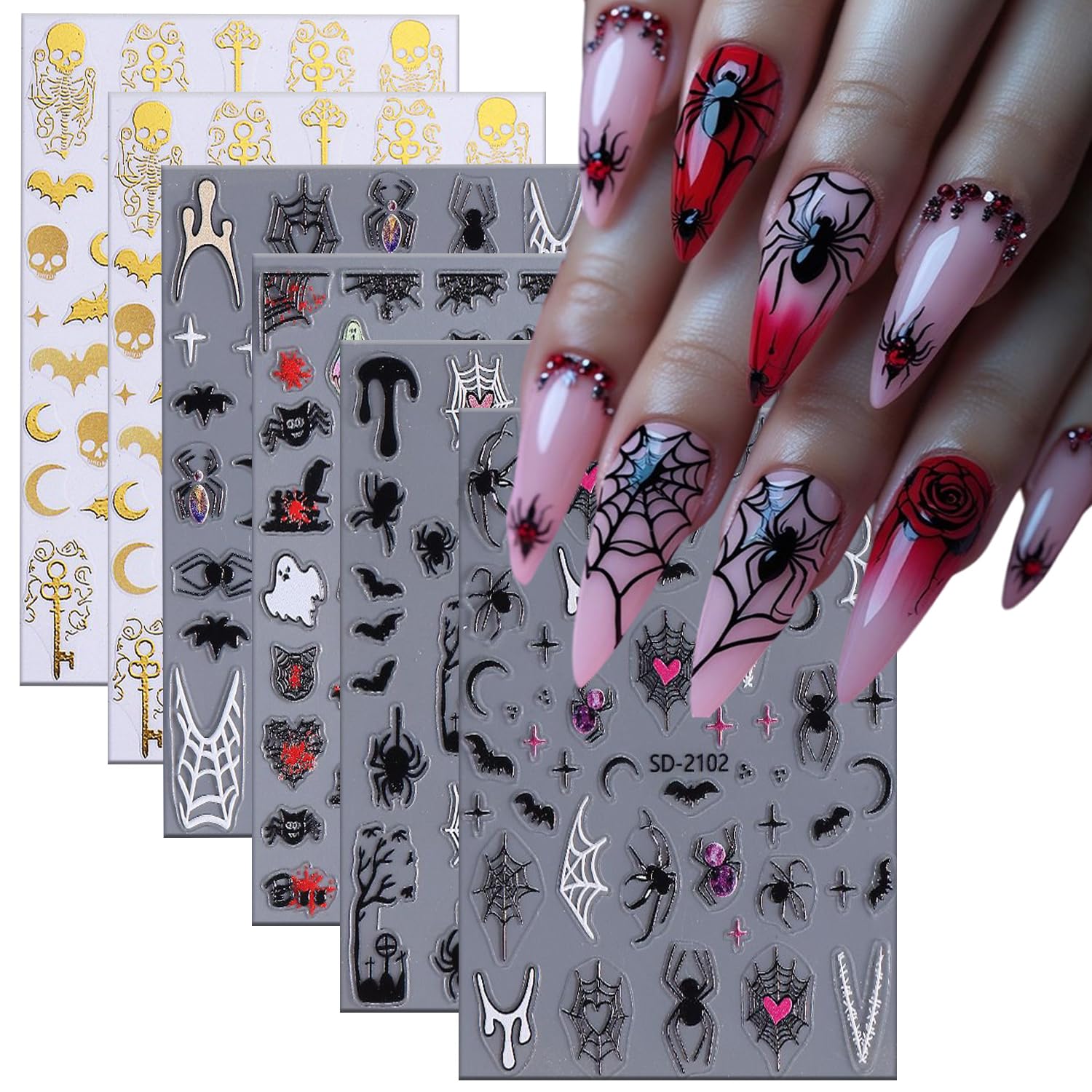 6 Sheets Halloween Nail Art Stickers 3D Self -Adhesive Ghost Bat Spider Nail Decals Holographic Spider Web Skeleton Blood Drop Nai