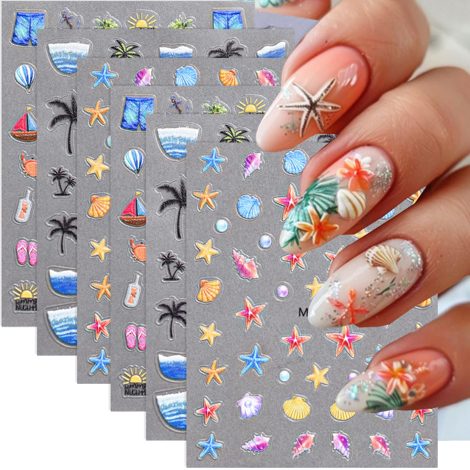 Calcomanías de uñas de océano, calcomanías de uñas coloridas con estrellas de mar, autoadhesivas, concha, perla, palmera, diseño d