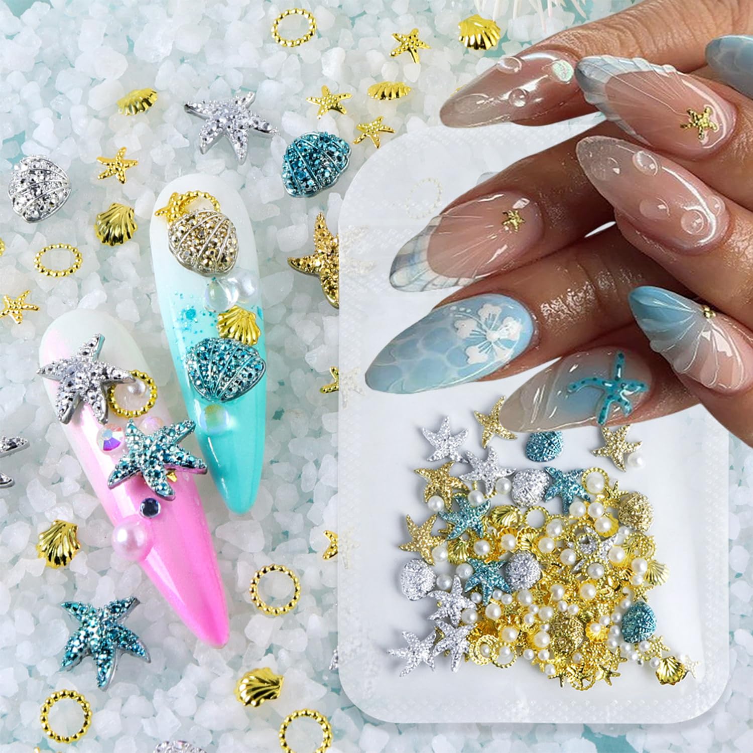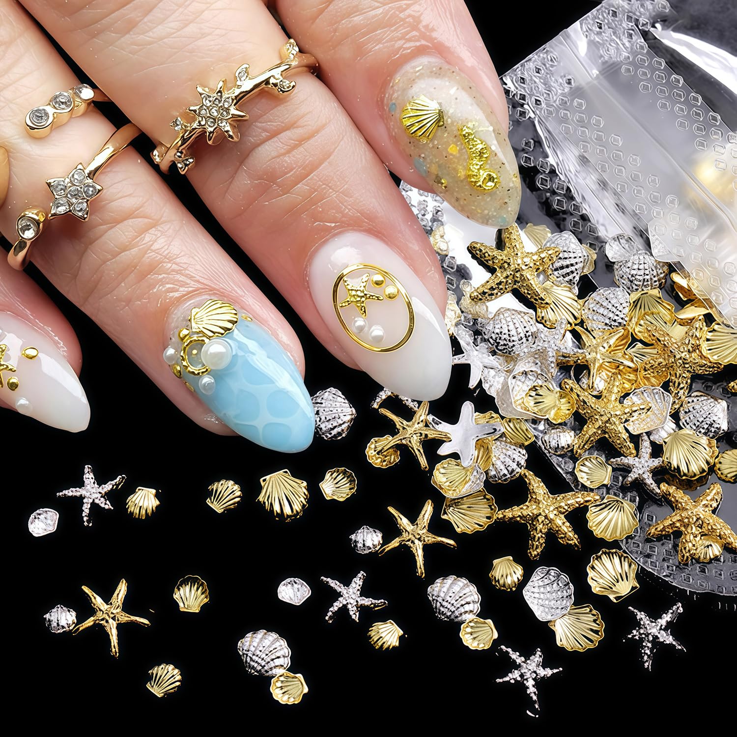 Abalorios de uñas de verano, temática oceánica, concha de estrella de mar dorada y plateada, diamantes de imitación mixtos para uñ