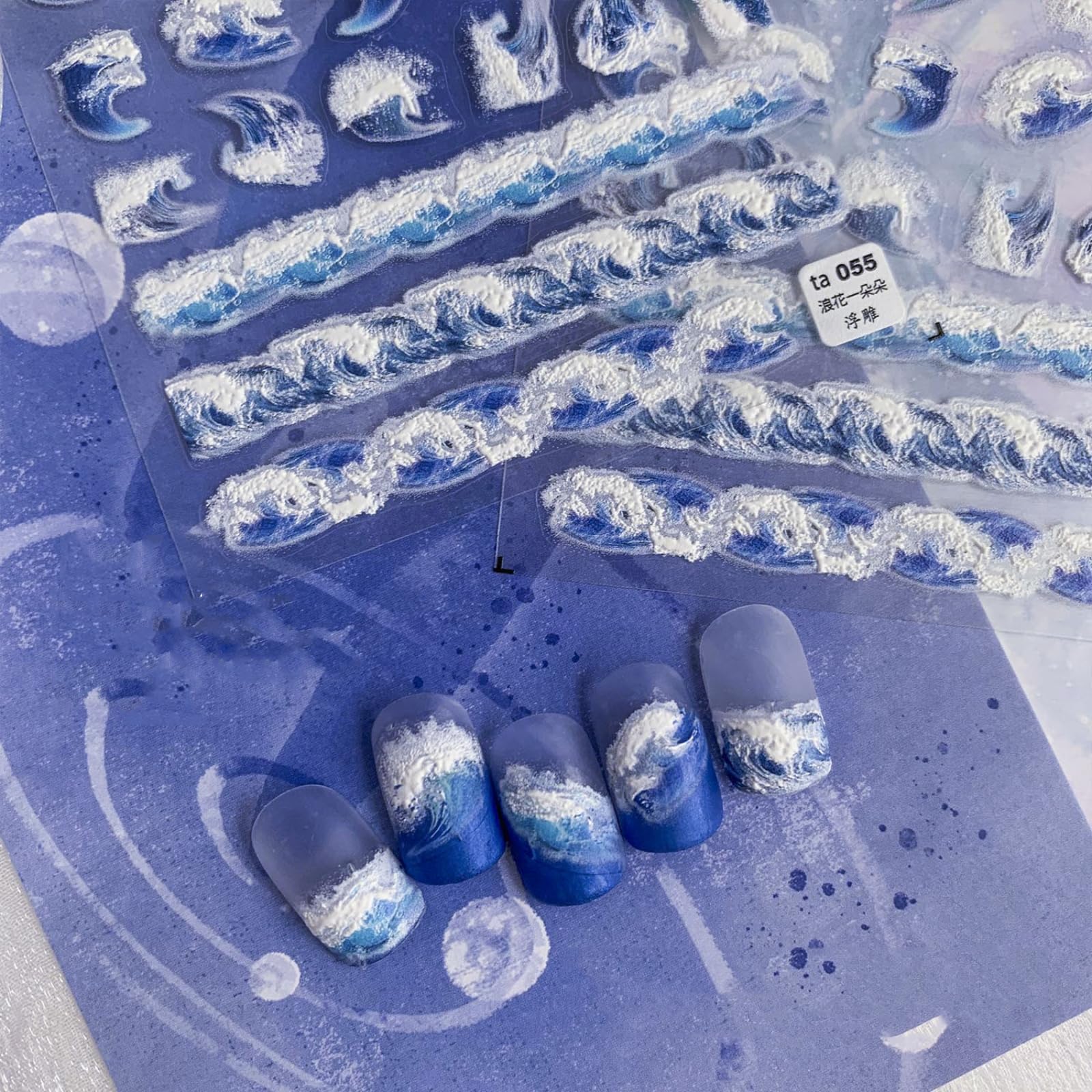 Calcomanías de arte de uñas de verano, calcomanías 5D en relieve para arte de uñas, calcomanías de océano con olas de mar azul, su