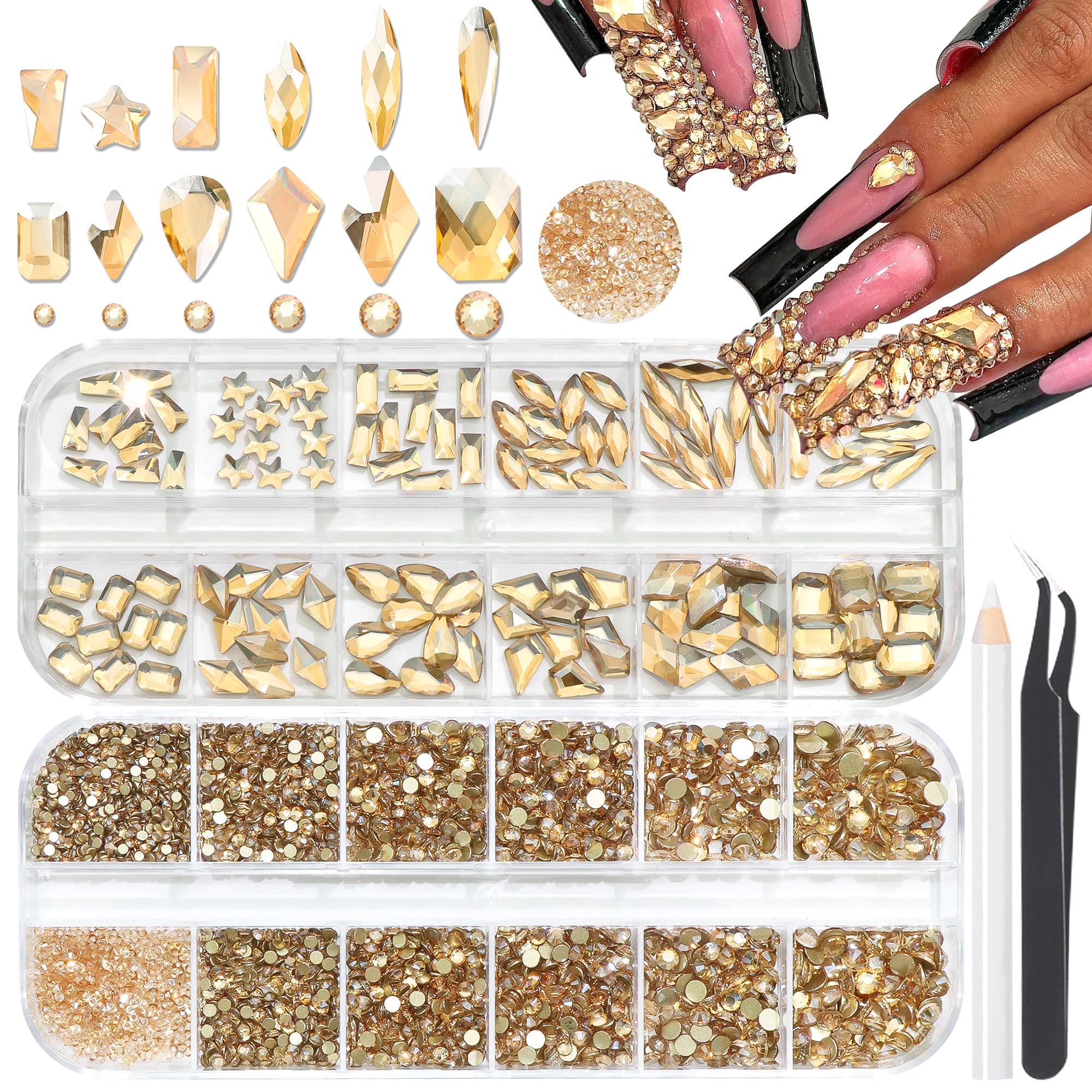 3520Pcs Champagne Gold Nail Rhinestones for Nails,Multi Shapes Flatback Nail Gems Round Crystal Rhinestone for Crafts,1.3-4MM Size