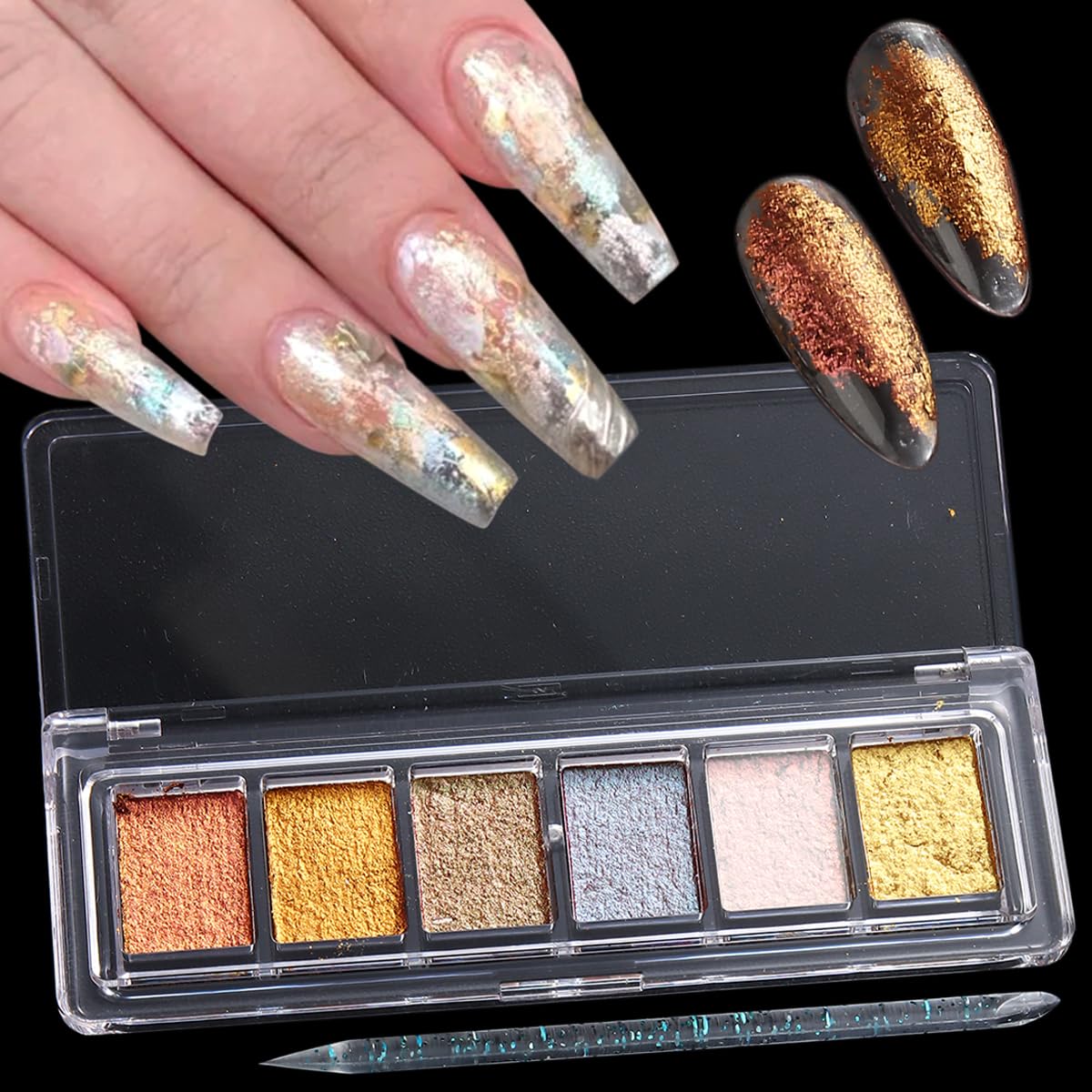Juego de purpurina metálica para uñas, 6 colores dorados para uñas, textura de barro, copos de cromo camaleón de hoja dorada, lámi