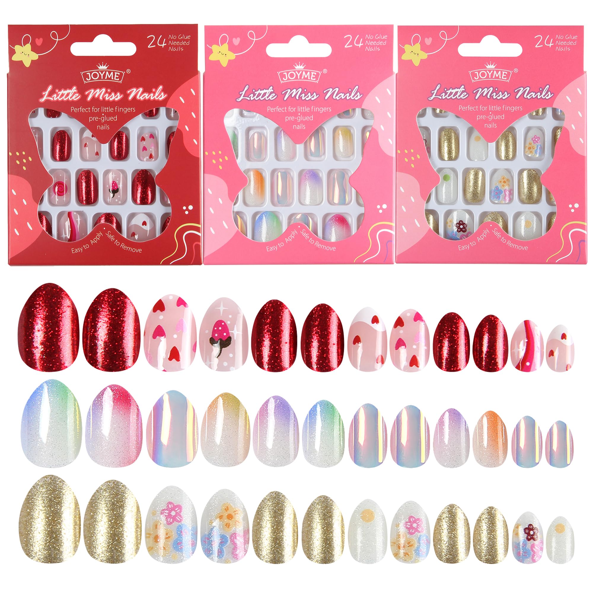 72 uñas postizas a presión para niños, paquete de 3 uñas postizas adhesivas de cobertura completa, uñas postizas cortas para niñas