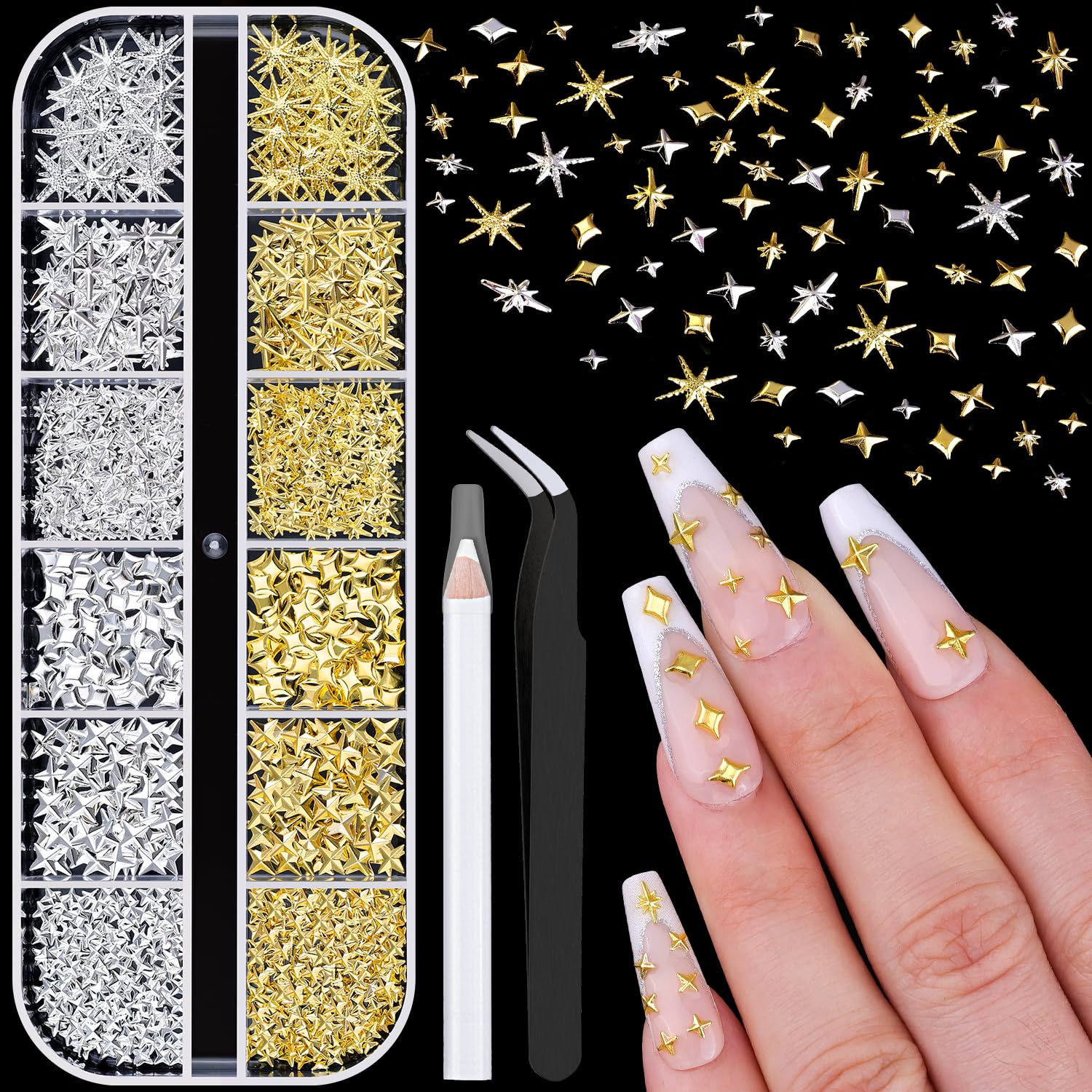 Dijes para uñas de estrella 3D, gemas metálicas multiformas doradas y plateadas, deslumbrantes cuentas de uñas pequeñas, joyas par