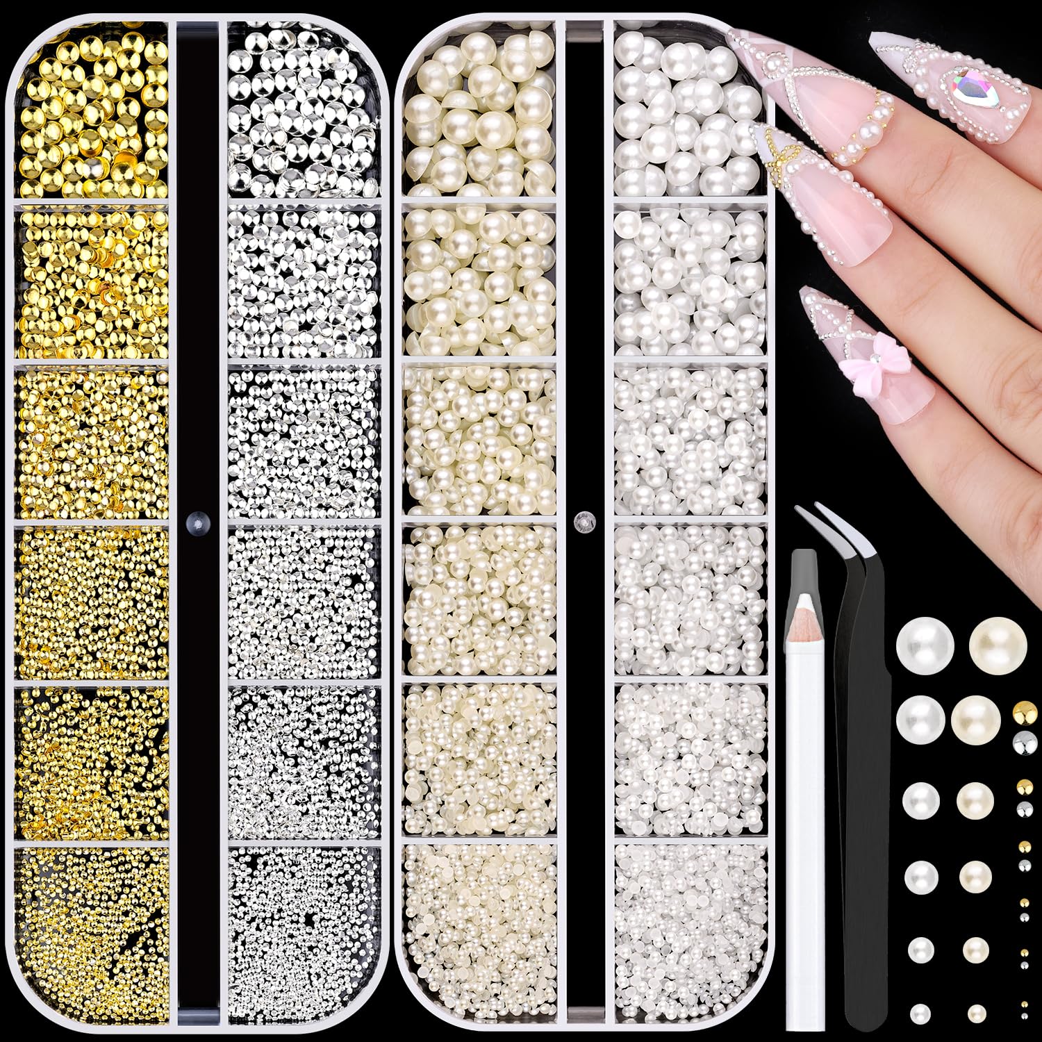 7500 dijes de uñas 3D, oro y plata, pequeñas gemas metálicas redondas de arte de uñas y cuentas de perlas blancas y beige, decorac