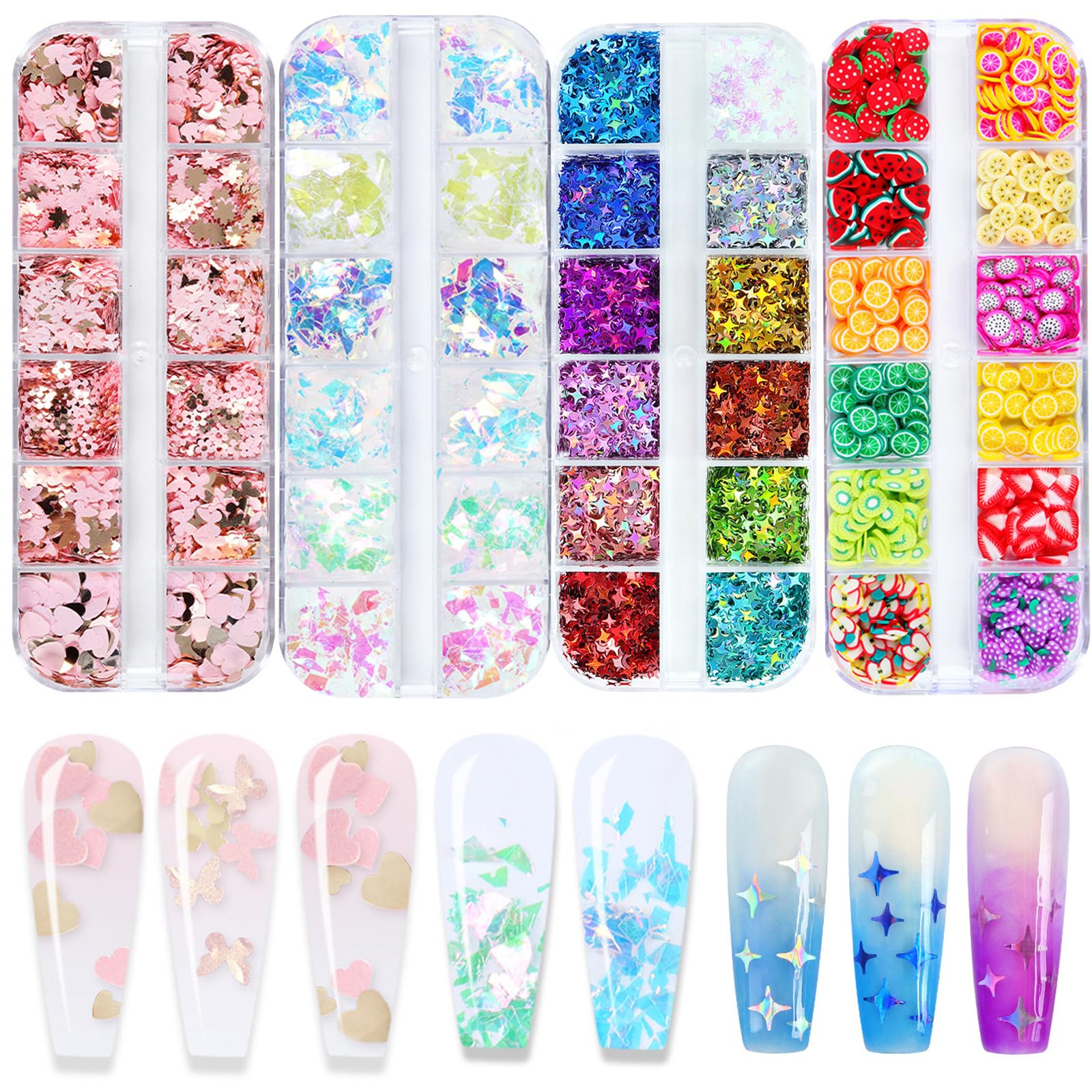 AddFavor 4 cajas de purpurina holográfica para uñas, mariposa, corazón, estrellas, lentejuelas, copos iridiscentes, rebanadas de u