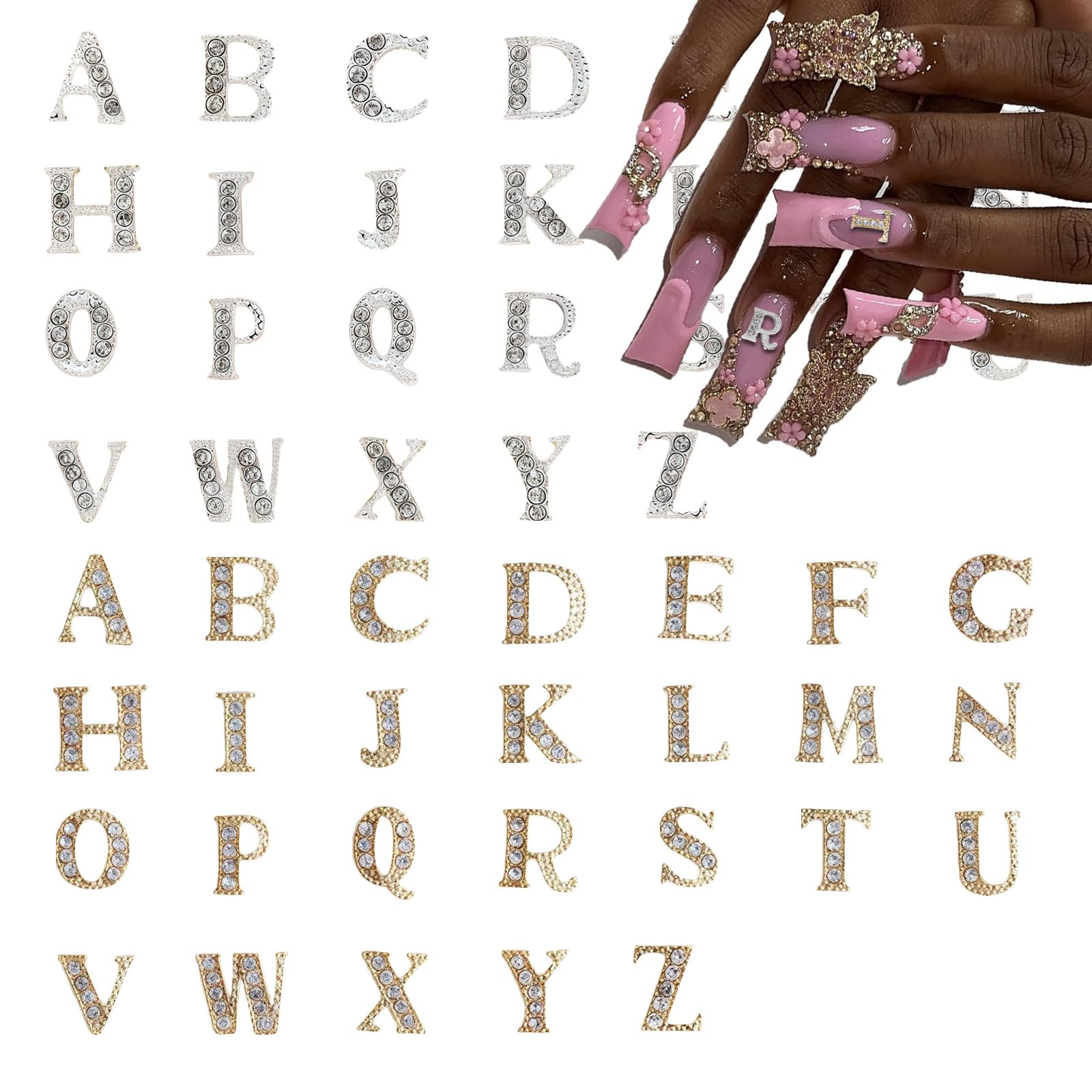 52 dijes de uñas 3D de plata y oro con letras iniciales para uñas, dijes de letras del alfabeto, diamantes de imitación, dijes de