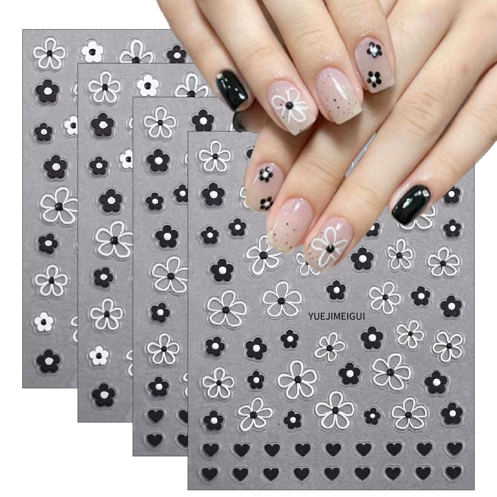 4 hojas de calcomanías de arte de uñas de flores en relieve, calcomanías de uñas de flores 5D, autoadhesivas en blanco y negro, ca