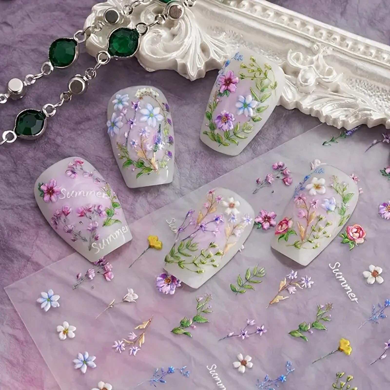 Calcomanías de arte de uñas de flores, calcomanías de arte de uñas florales de primavera, diseño de margaritas lavanda y flores si