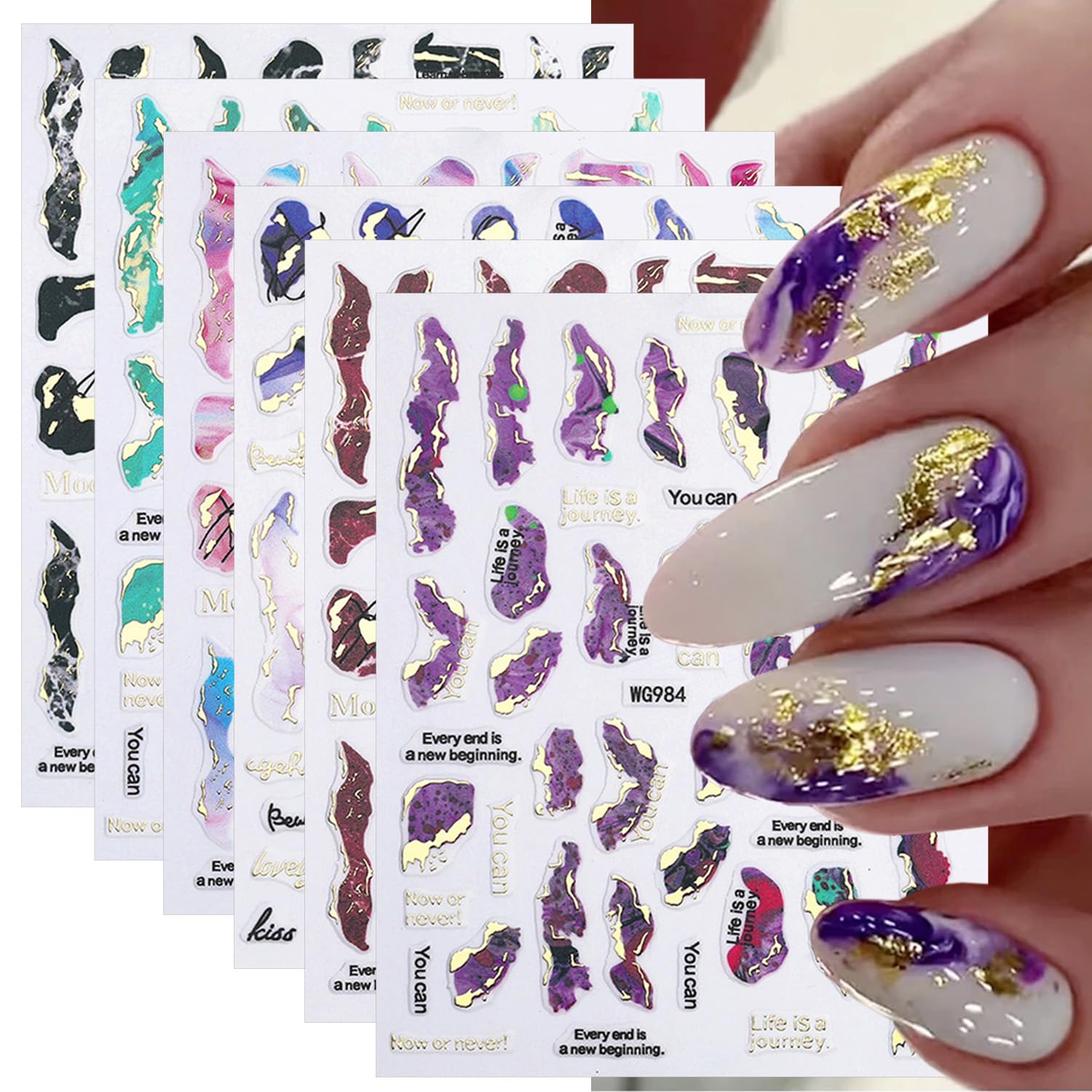 6 hojas de calcomanías de uñas de mármol dorado bronceado 3D, calcomanías de arte de uñas de mármol dorado, calcomanías de uñas fl