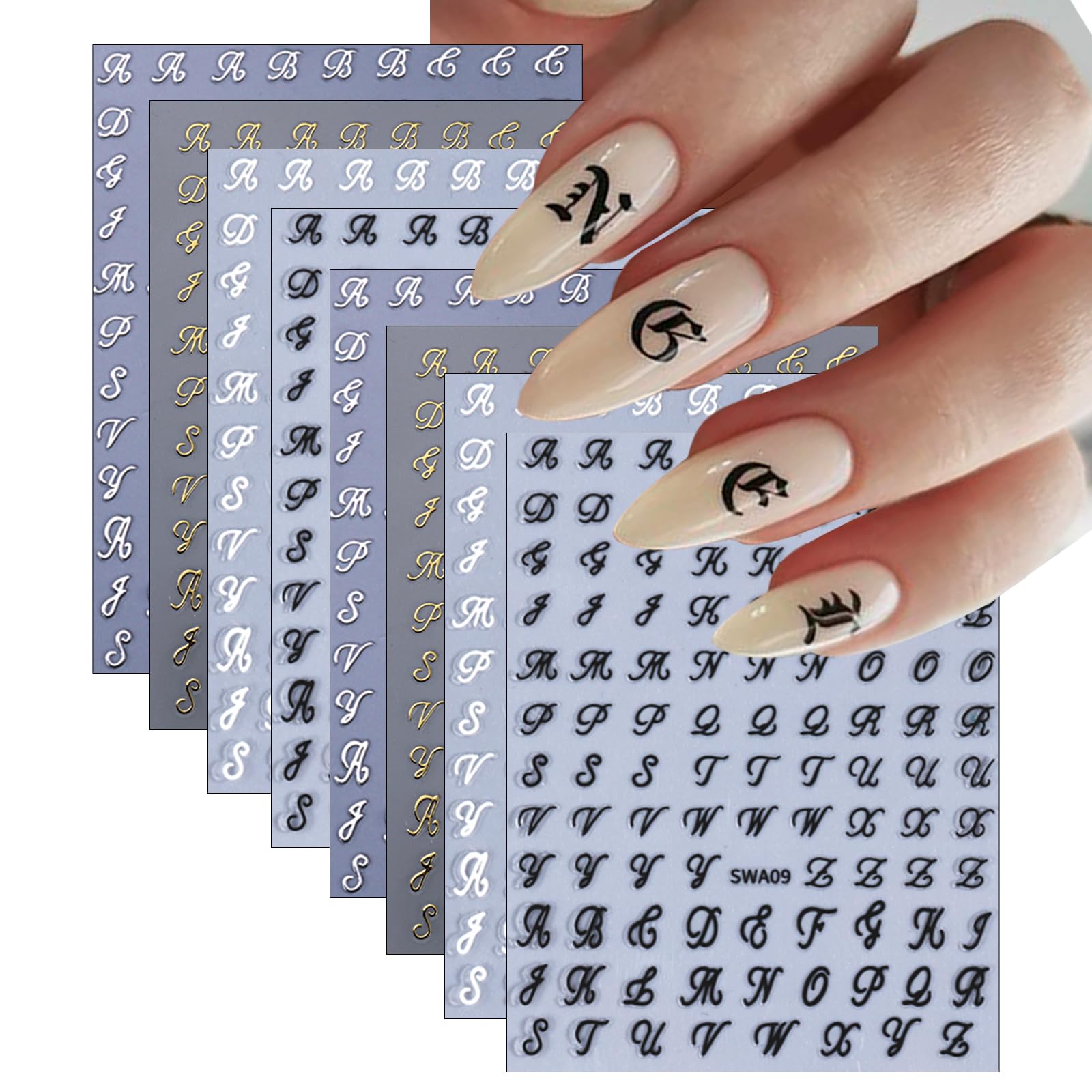 8 hojas de calcomanías de uñas en inglés antiguo, 3D, autoadhesivas, holográficas, letras inglesas, blancas, negras, doradas, plat