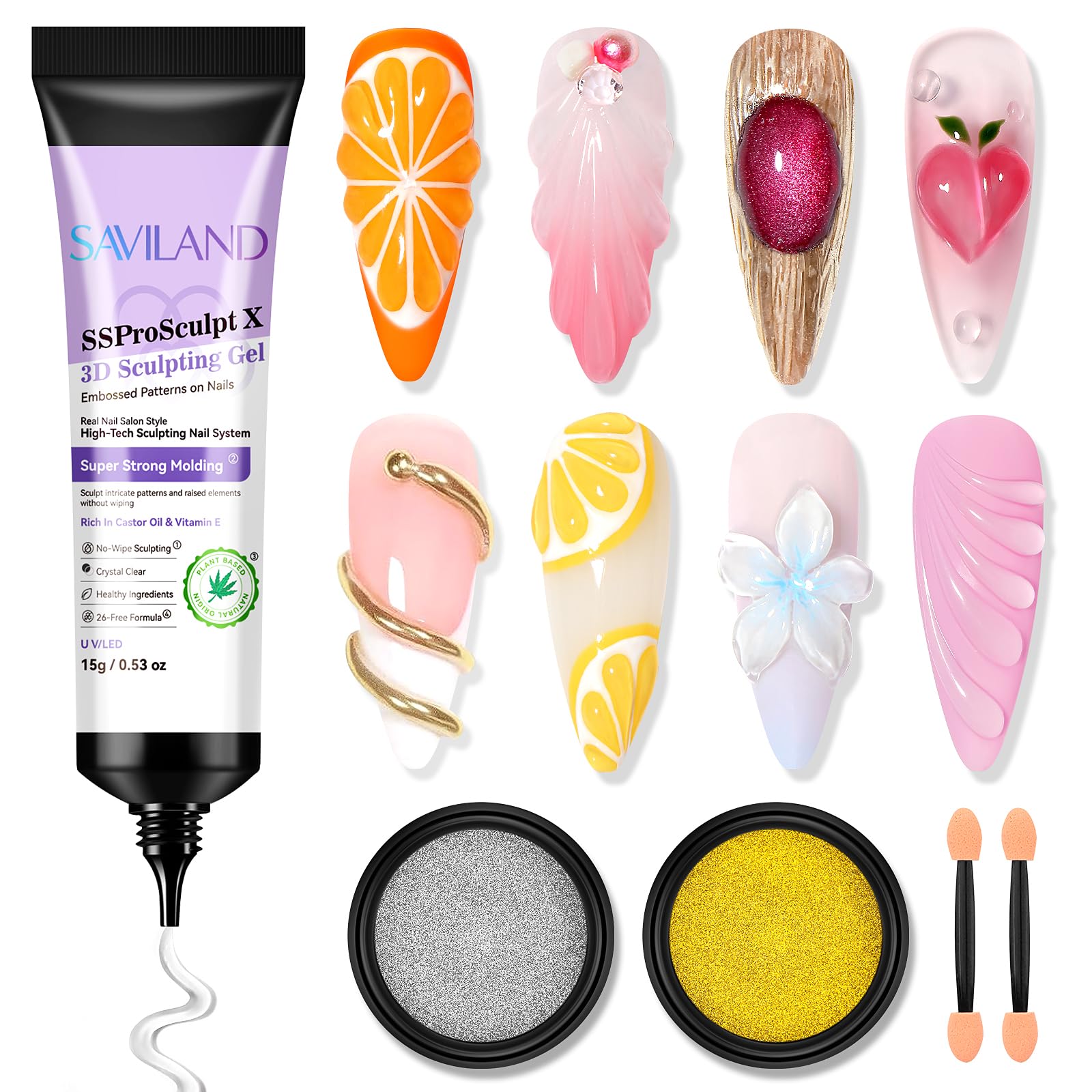SAVILAND Kit de gel de uñas 3D y polvo de cromo: 0.53 oz de gel de escultura transparente para diseño de uñas 3D con polvos cromad