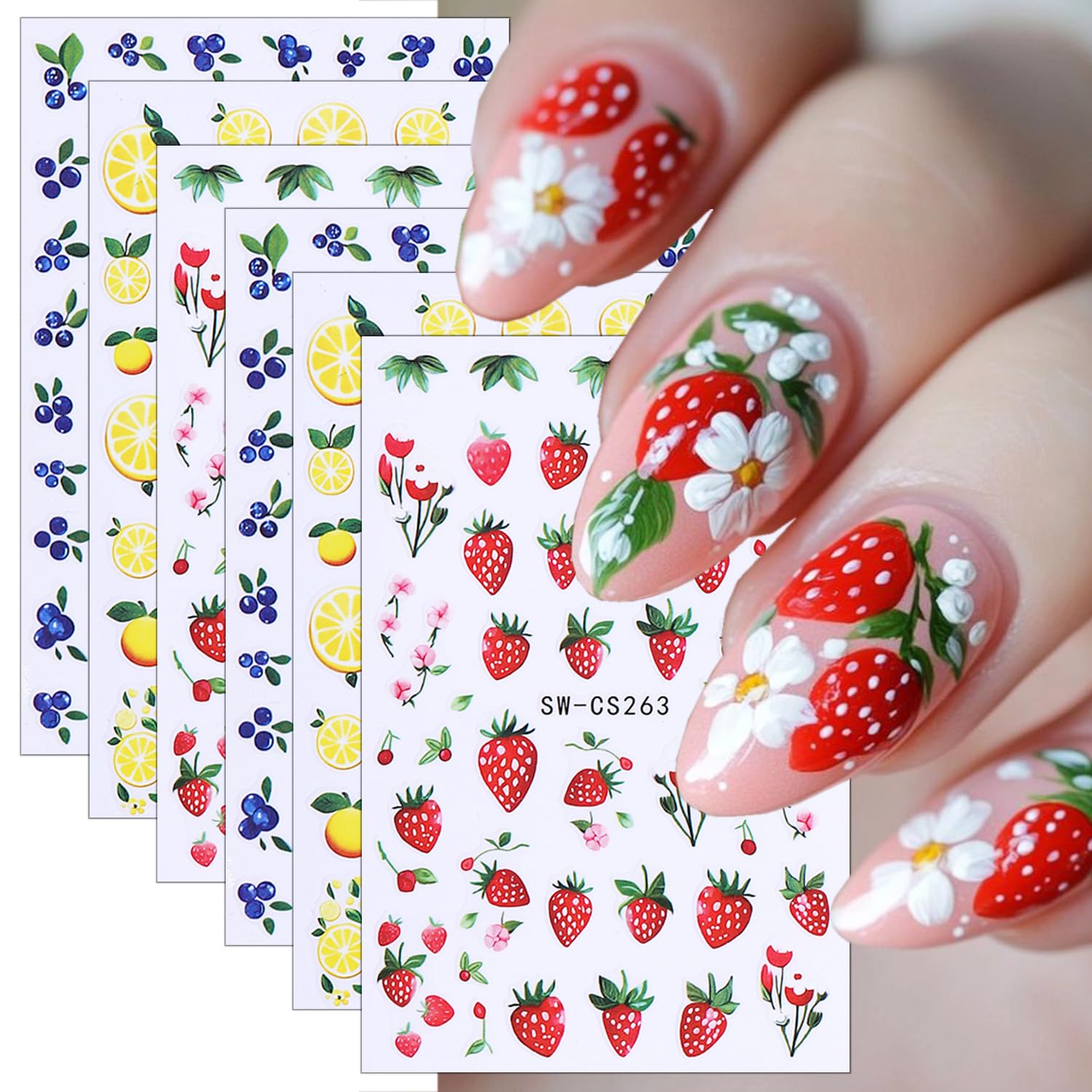 6 hojas de calcomanías de uñas de frutas para arte de uñas 3D autoadhesivas de verano calcomanías de arte de uñas de arándano, lim