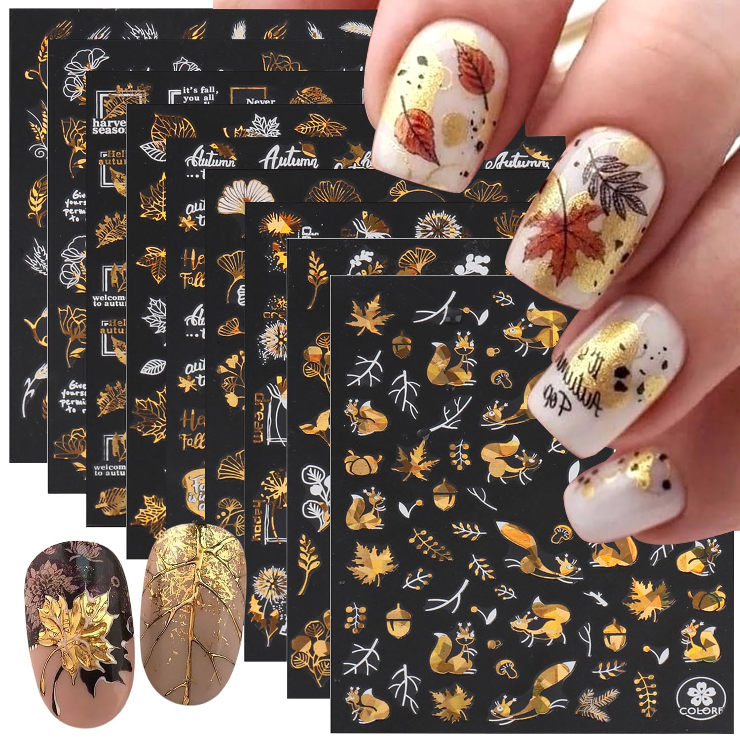 9 hojas de calcomanías de otoño para arte de uñas, hojas de arce, diseño de árbol de flores, calcomanías de diseño de uñas 3D auto