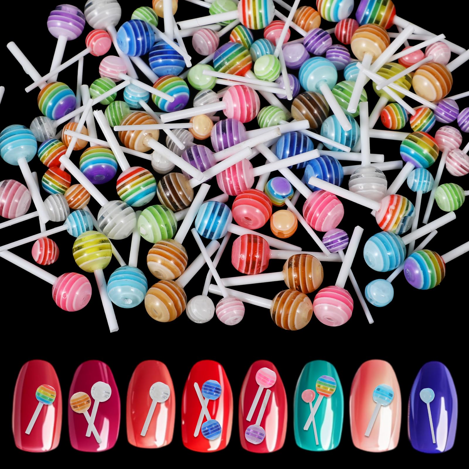 100 dijes de uñas de piruleta para uñas, decoración de acrílico 3D, 2 tamaños, mini diseños de azúcar kawaii, accesorios coloridos