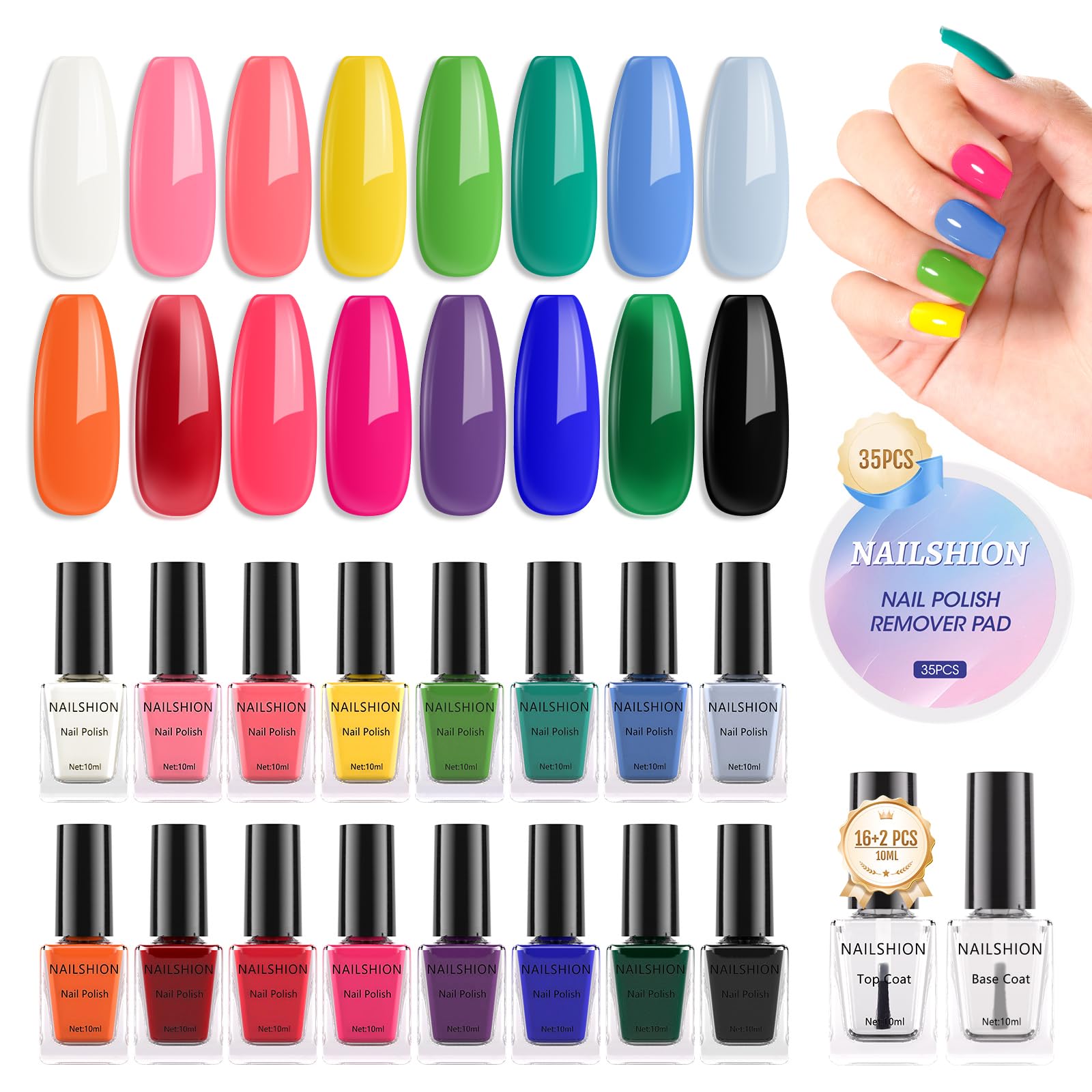 Esmalte de uñas | Juego de esmaltes de uñas regulares de secado al aire de 16 colores arcoíris blanco con capa base superior y alm