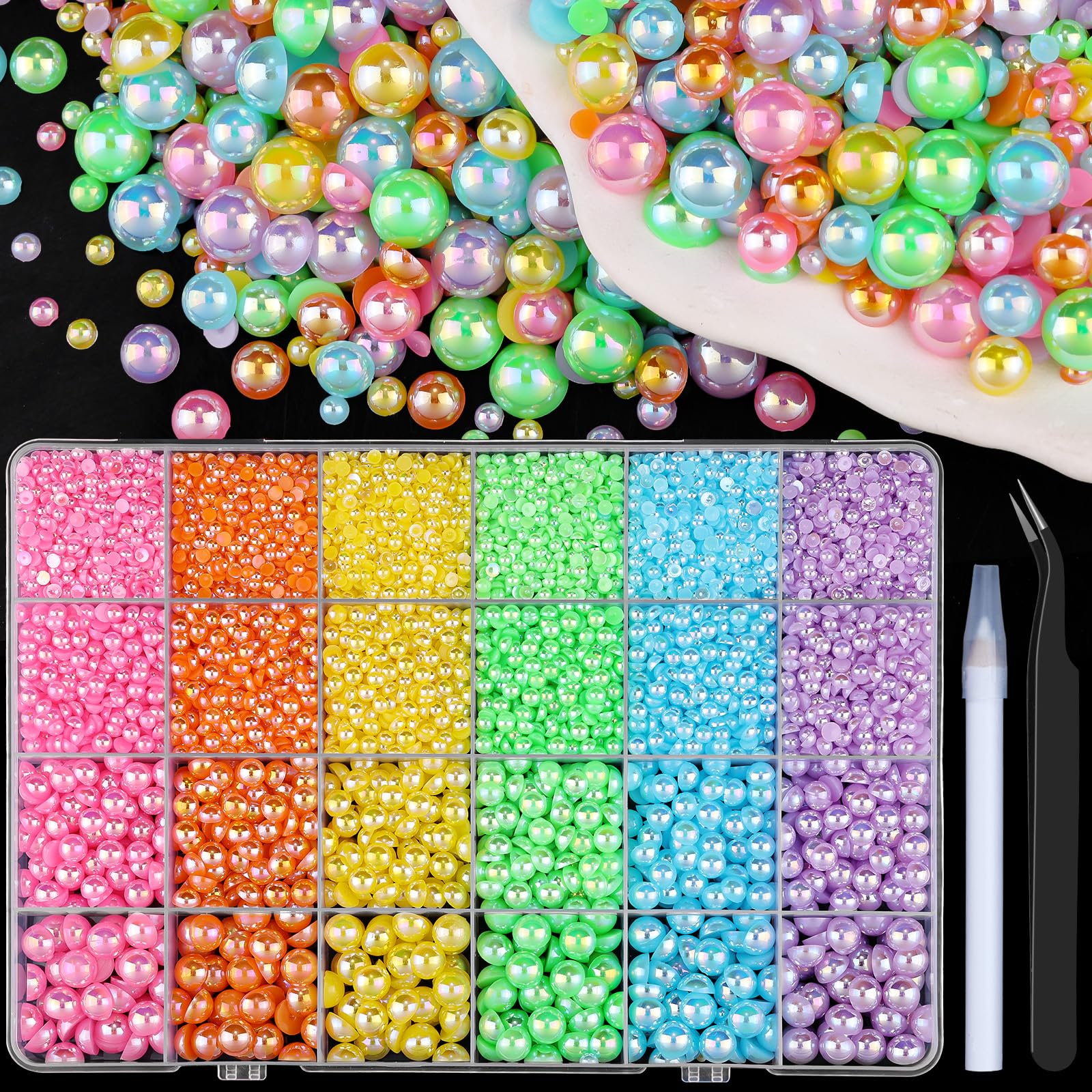 Perlas planas para manualidades, medias perlas iridiscentes de 0.31 a 0.315 pulgadas con herramientas de recogida, cuentas deslumb