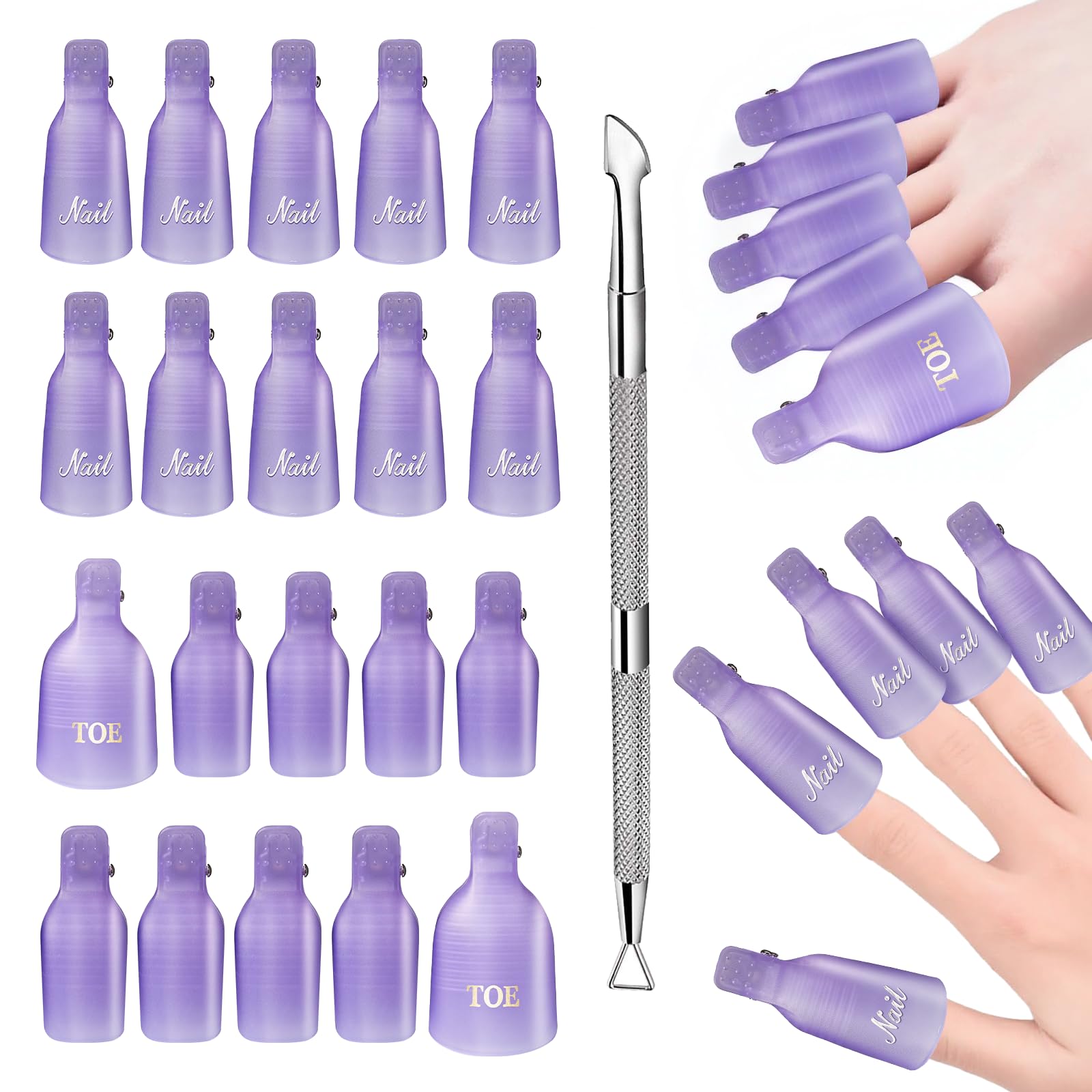 Makartt Clips de uñas para quitar el esmalte de gel, con empujador de cutículas de metal de doble extremo, 20 piezas de plástico r