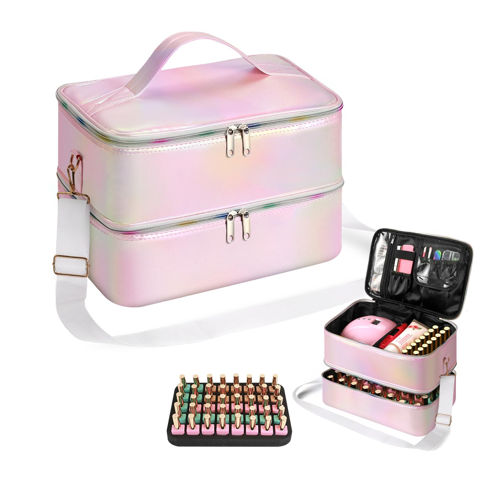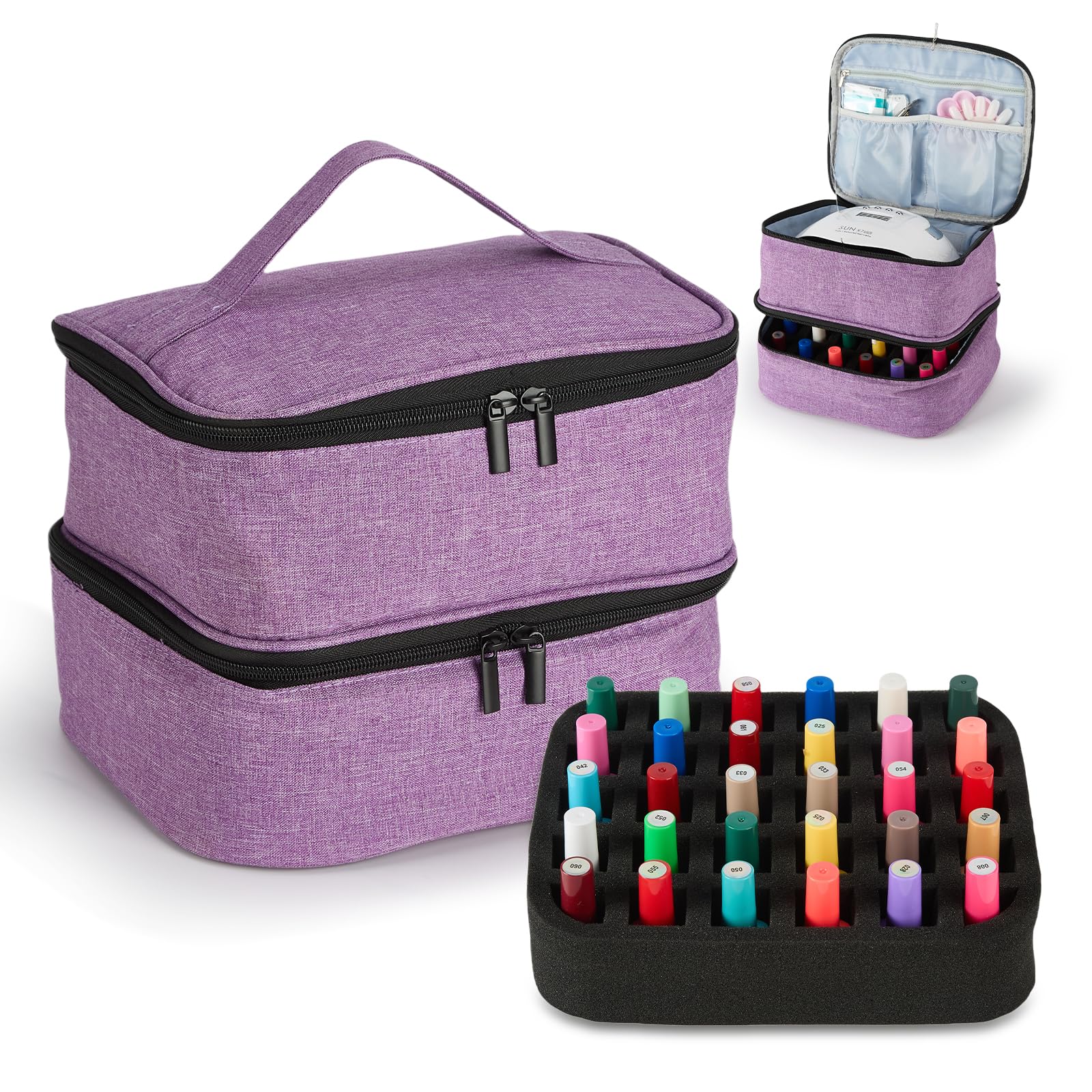 Bolsa organizadora de esmalte de uñas, bolsa organizadora de maquillaje de doble capa, con capacidad para 30 botellas y lámpara de