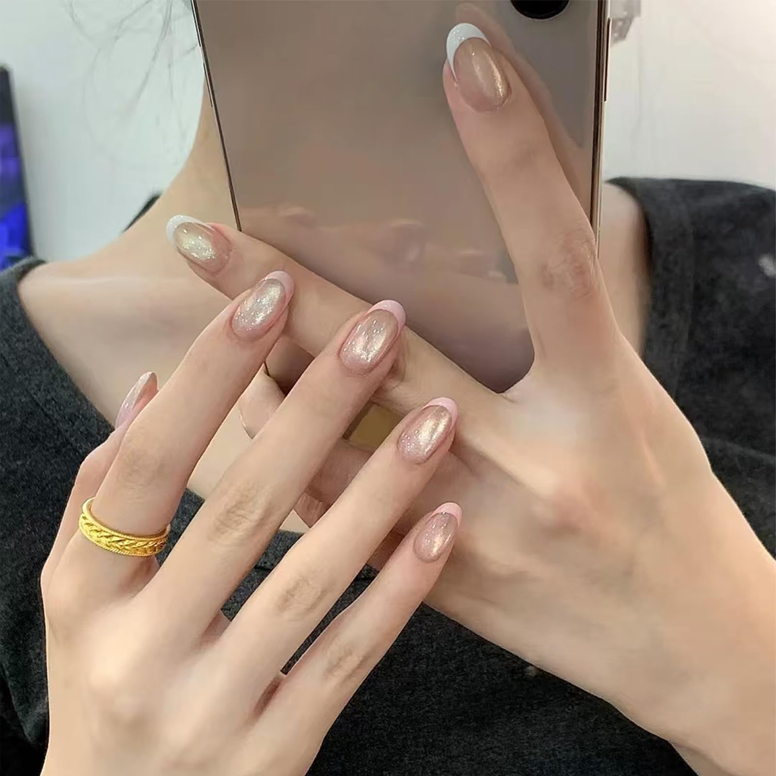 Nude Moonlight – Uñas postizas a presión con diseño de ojo de gato, cortas ovaladas, 32 unidades, 16 tamaños, gel suave, blanco y