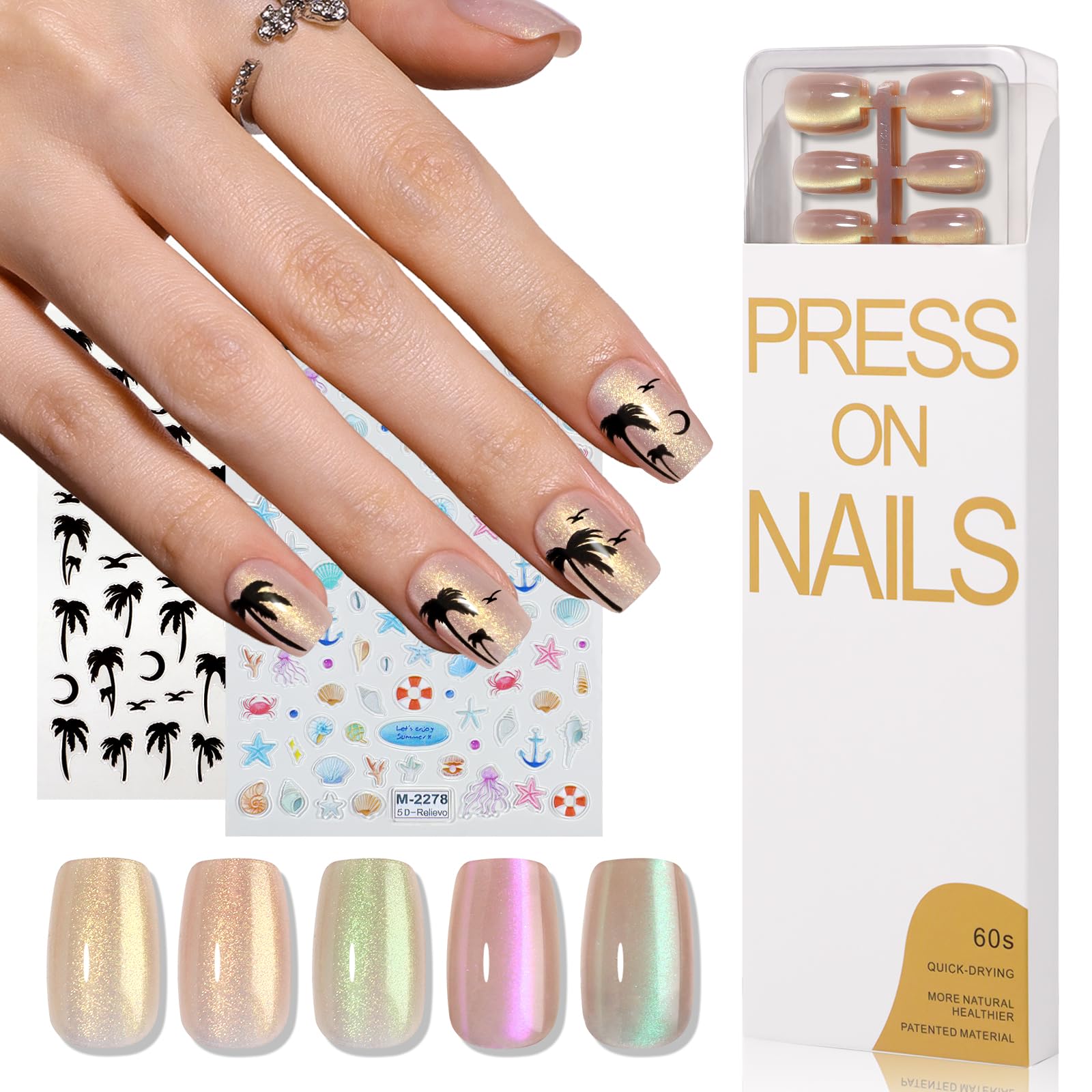 150 uñas a presión con diseño de ojo de gato con purpurina camaleón, 5 colores brillantes, sirena, rosa, azul, morado, holográfica