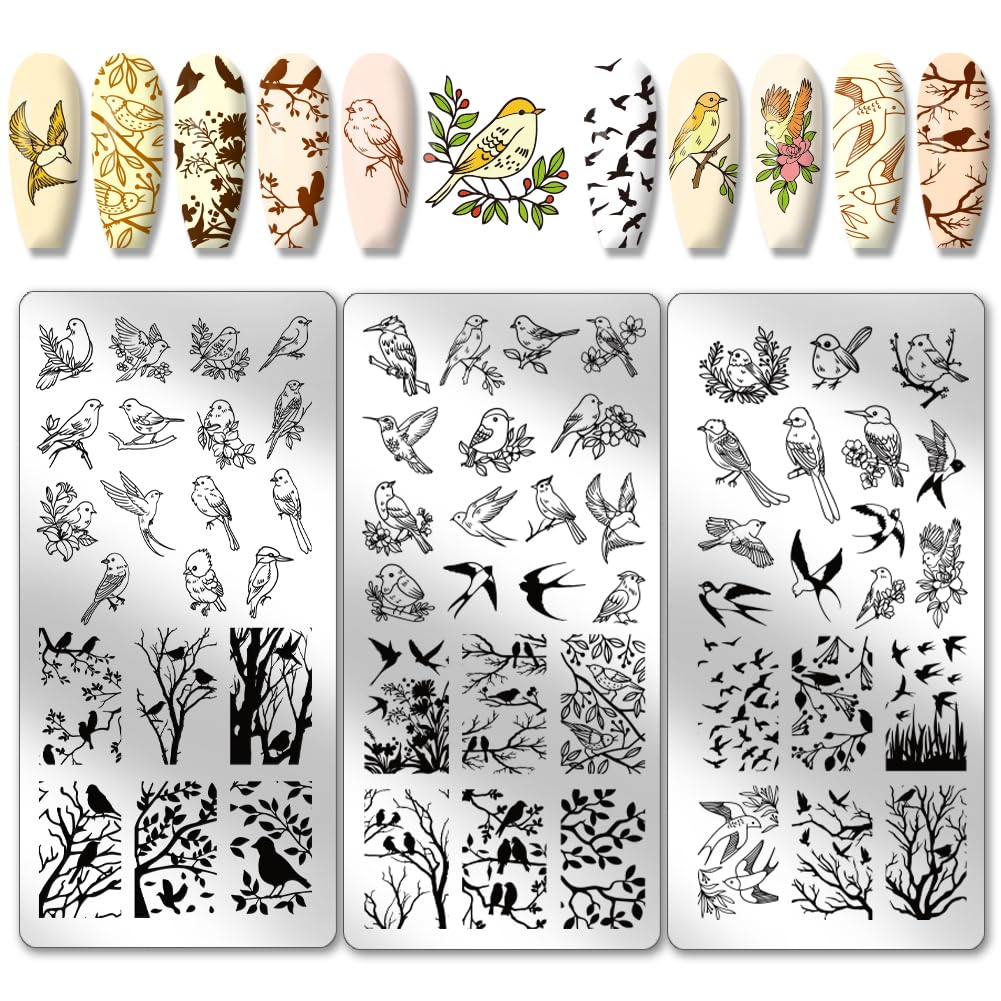 PH PandaHall 3 placas de estampado de uñas de pájaro, plantillas de arte de uñas de animales de golondrina, plantillas de arte de