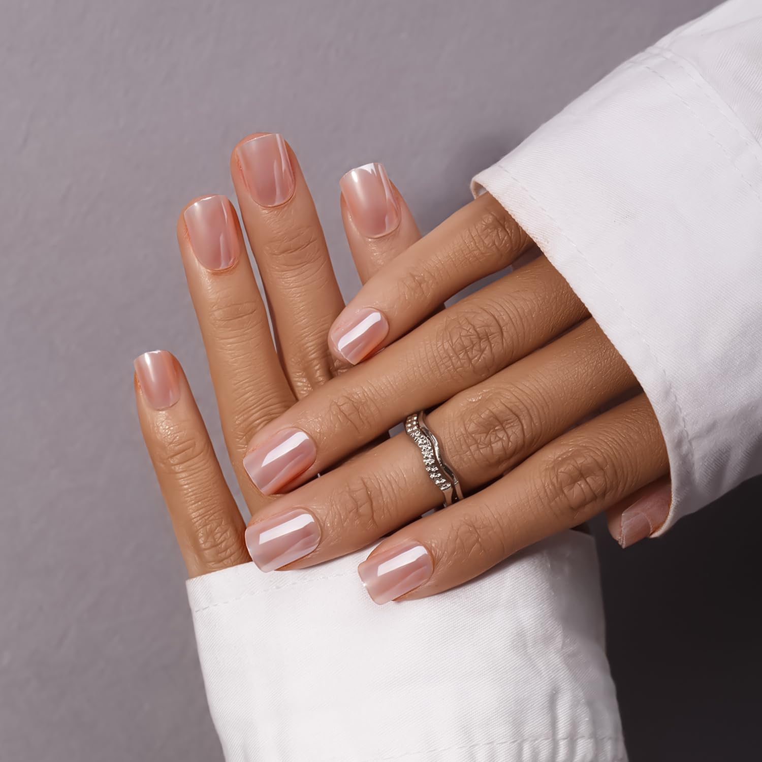 KQueenest Uñas a presión cromadas cortas medianas cuadradas, uñas a presión rosa nude con purpurina, uñas postizas brillantes esma