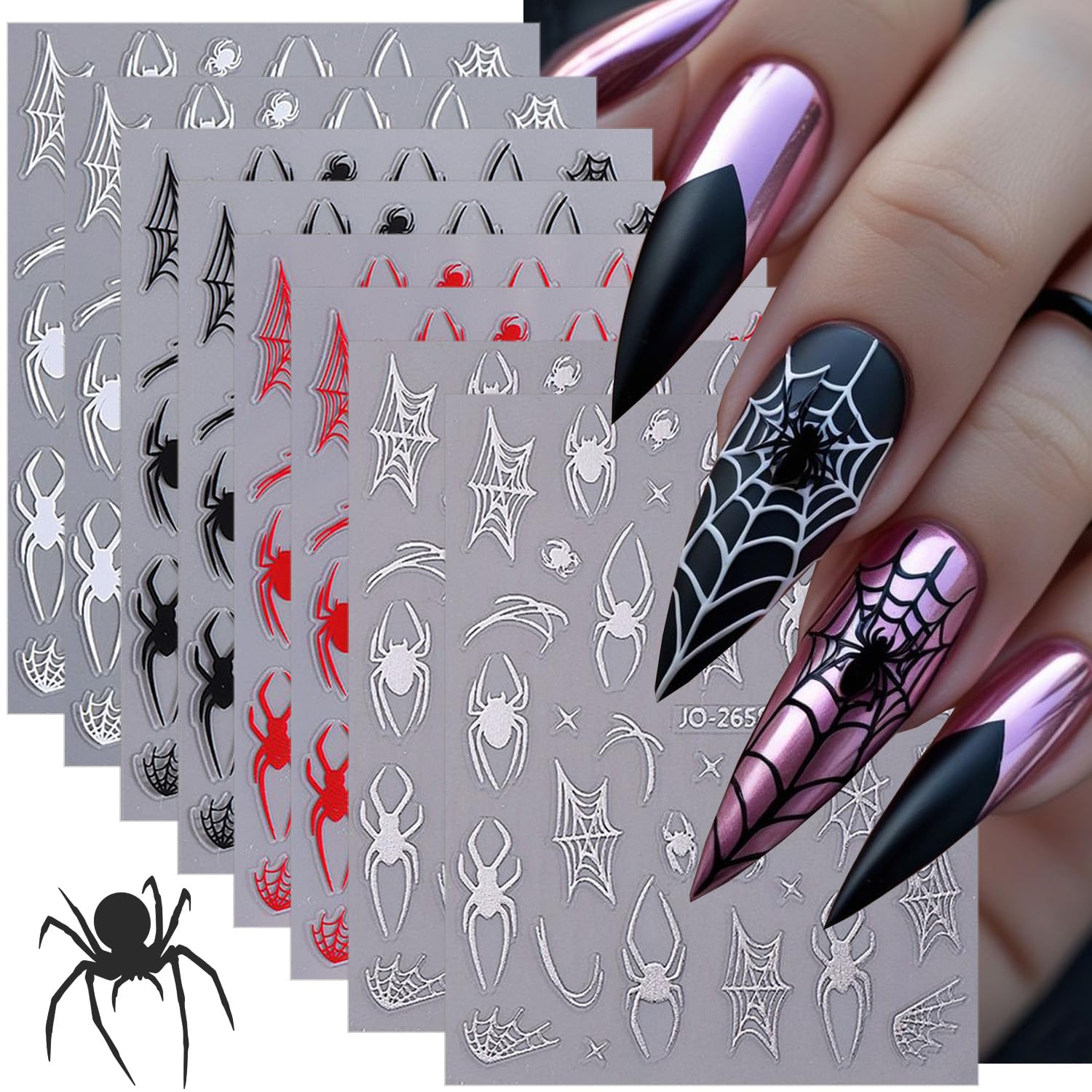 8 Sheets Halloween Nail Stickers 3D Self-Adhesive Spider Web Nail Art Stickers Black White Silver Gold Spider Design Festival Nail