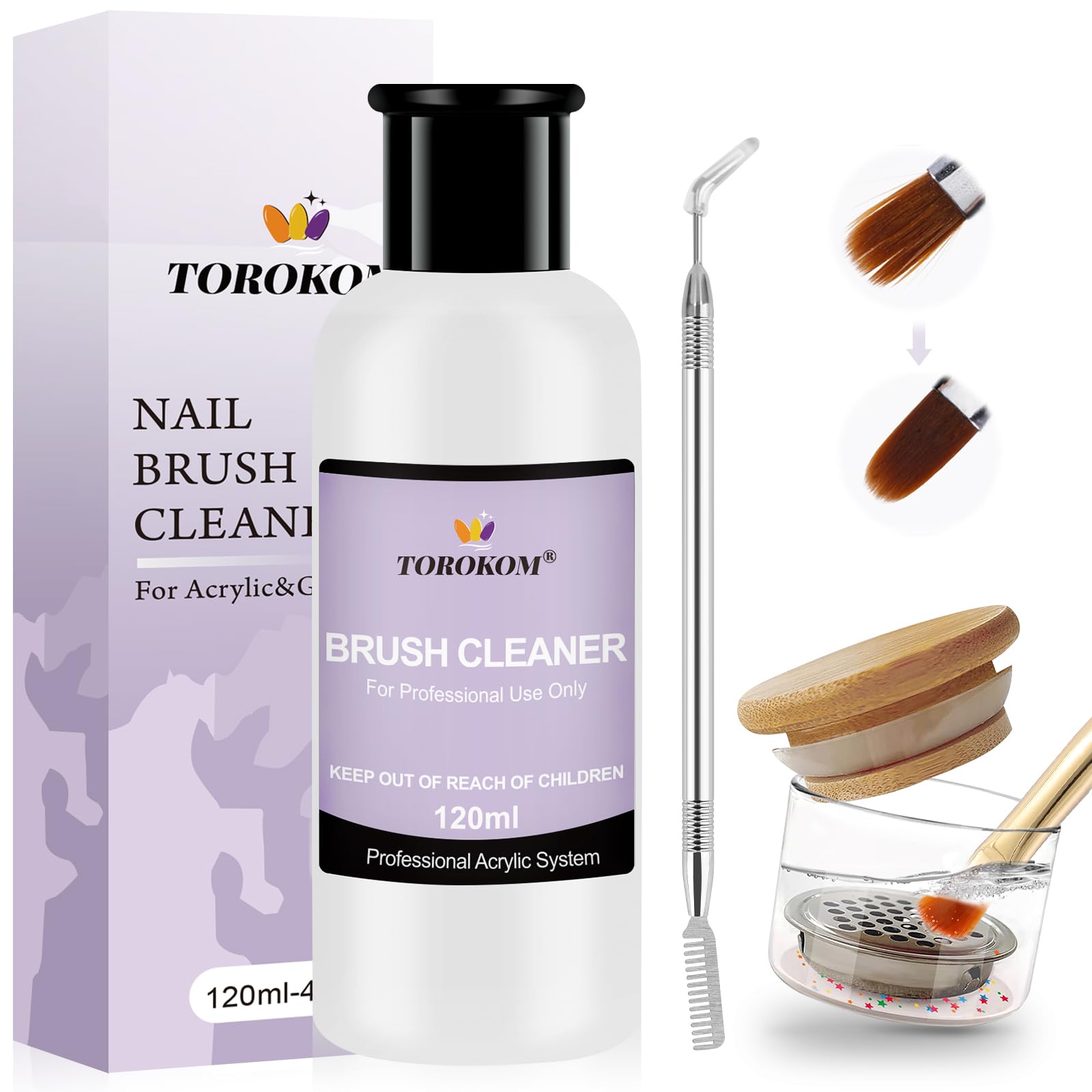 TOROKOM Acrylic Nail Brush Cleaner, 4 OZ Acrylic Brush Cleaner Nail Brush Cleaner Conditioner with Dappen Dish and Scrub Brush for