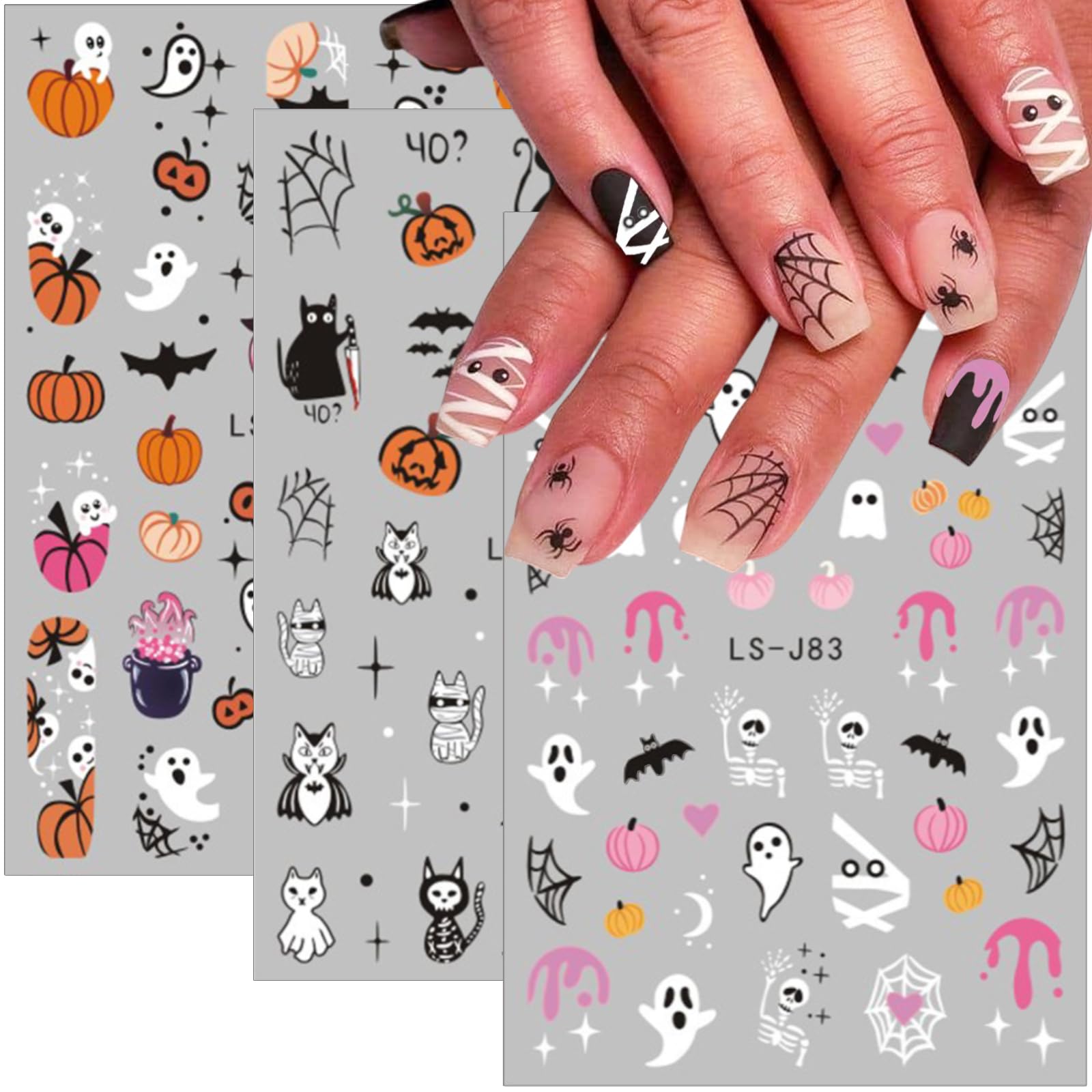 Halloween Nail Stickers Cartoon Ghost Nail Decals Gothic Nail Art Stickers Self-Adhesive Pumpkin Bat Cat Spider Web Nails Design S