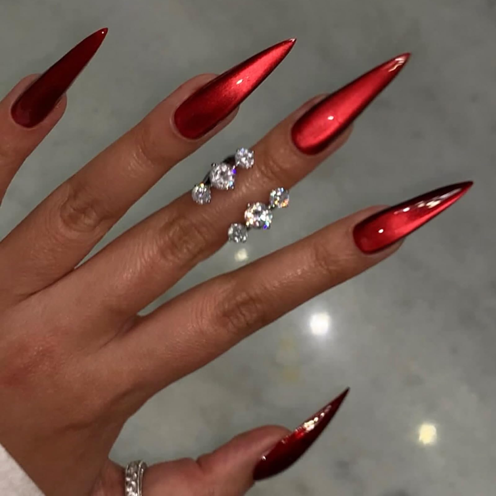 Red Press on Nails – Long Stiletto Fake Nails | Cat Eye Acrylic Nails with Glitter,Full Cover Glossy False Nails,Reusable Stick on
