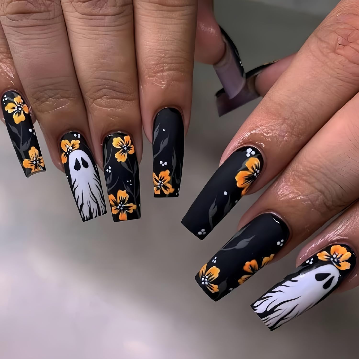 Halloween Press on Nails Long Coffin Fake Nails Black False Nails with Ghost Orange Flower Design Glue on Nails Square Acrylic Nai