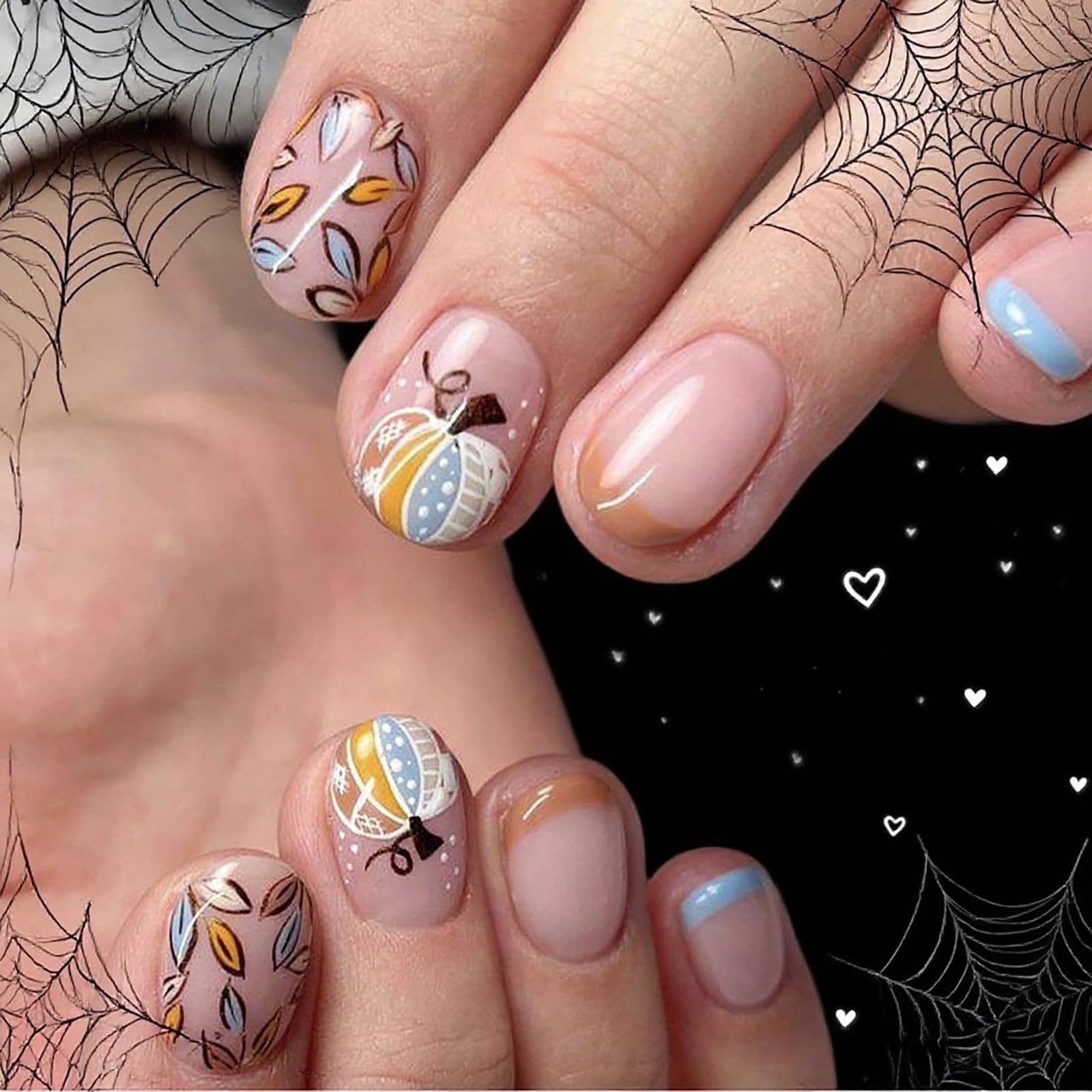 24Pcs Halloween Oval Press on Nails Short Acrylic Fake Nails Press ons French Tip False Nails with Pumpkin Maple Leaves Design Fal