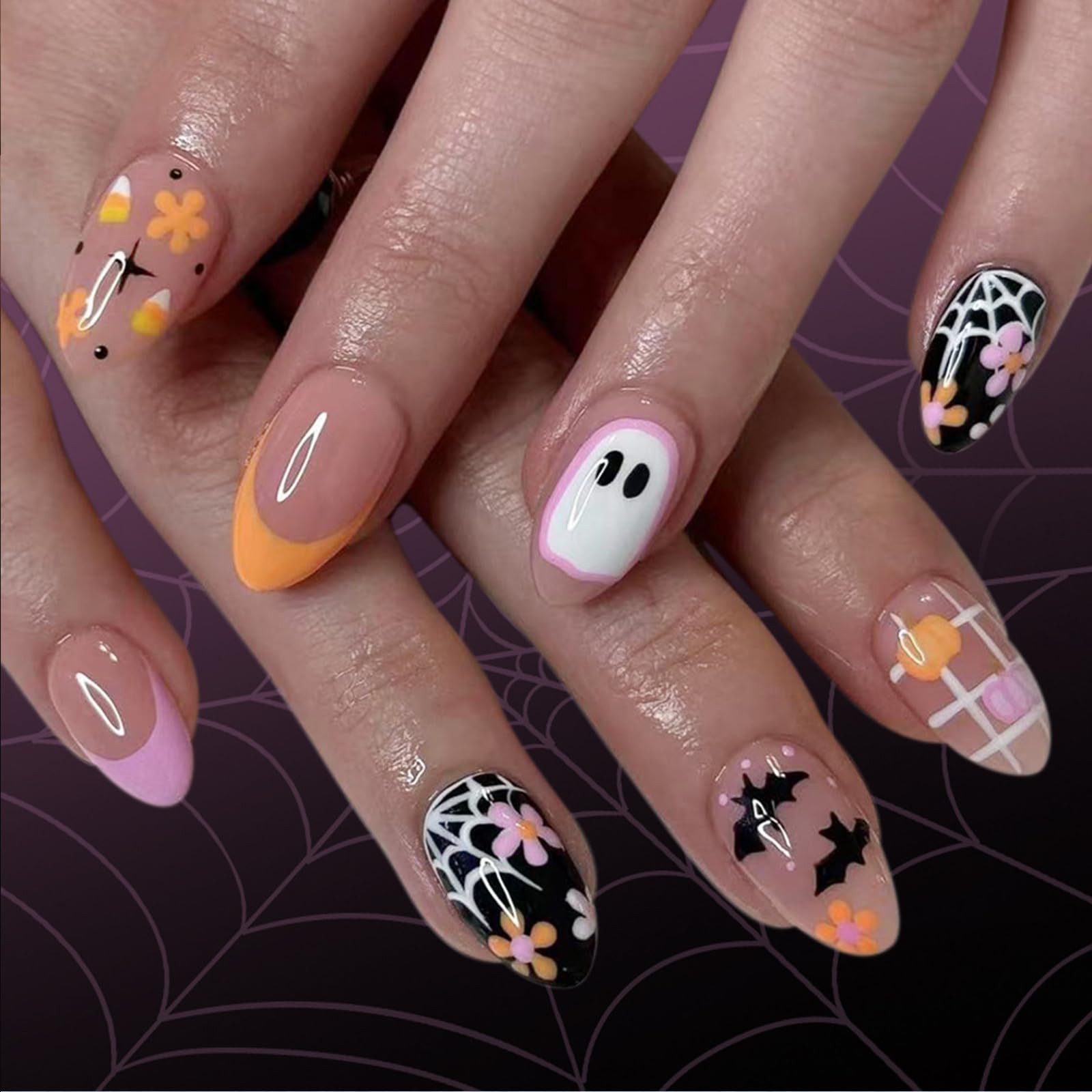 24Pcs Short Press on Nails Almond Fake Nails with Cute Flower Design Halloween Acrylic Nails French Tip Fake Nails Ghost Spider We
