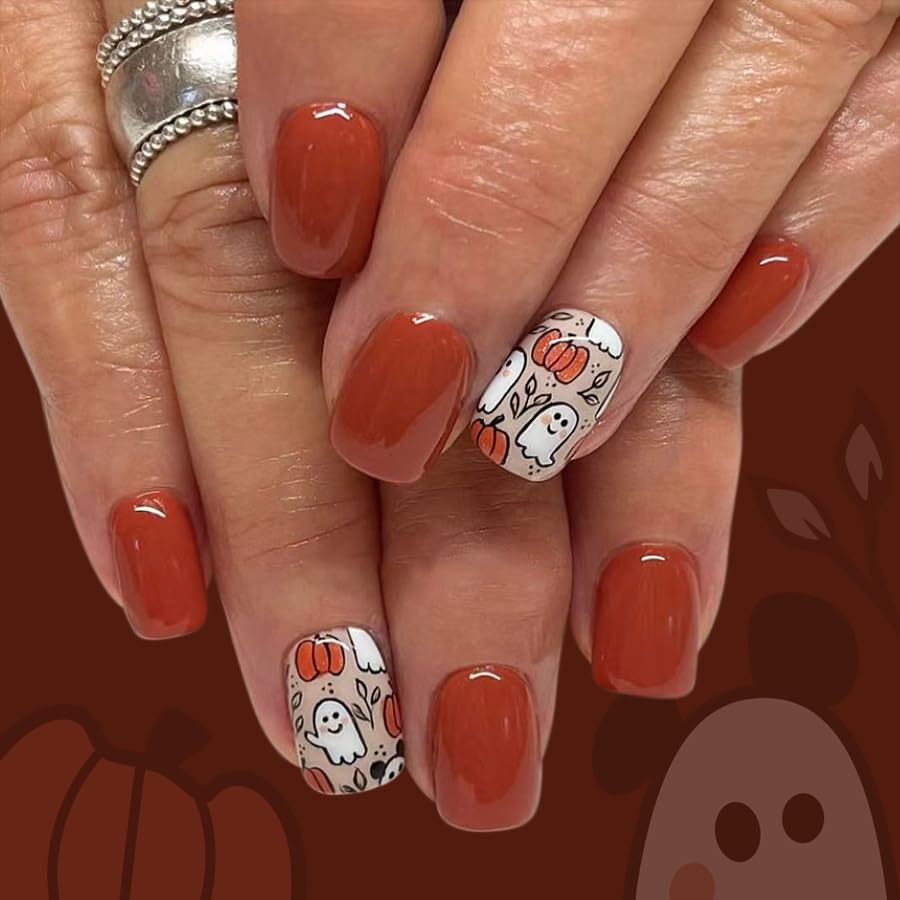 Halloween Press on Nails Light Brown Fake Nails Short Square False Nails with Cute Ghost Pumpkin Designs Brown Glue on Nails Stick
