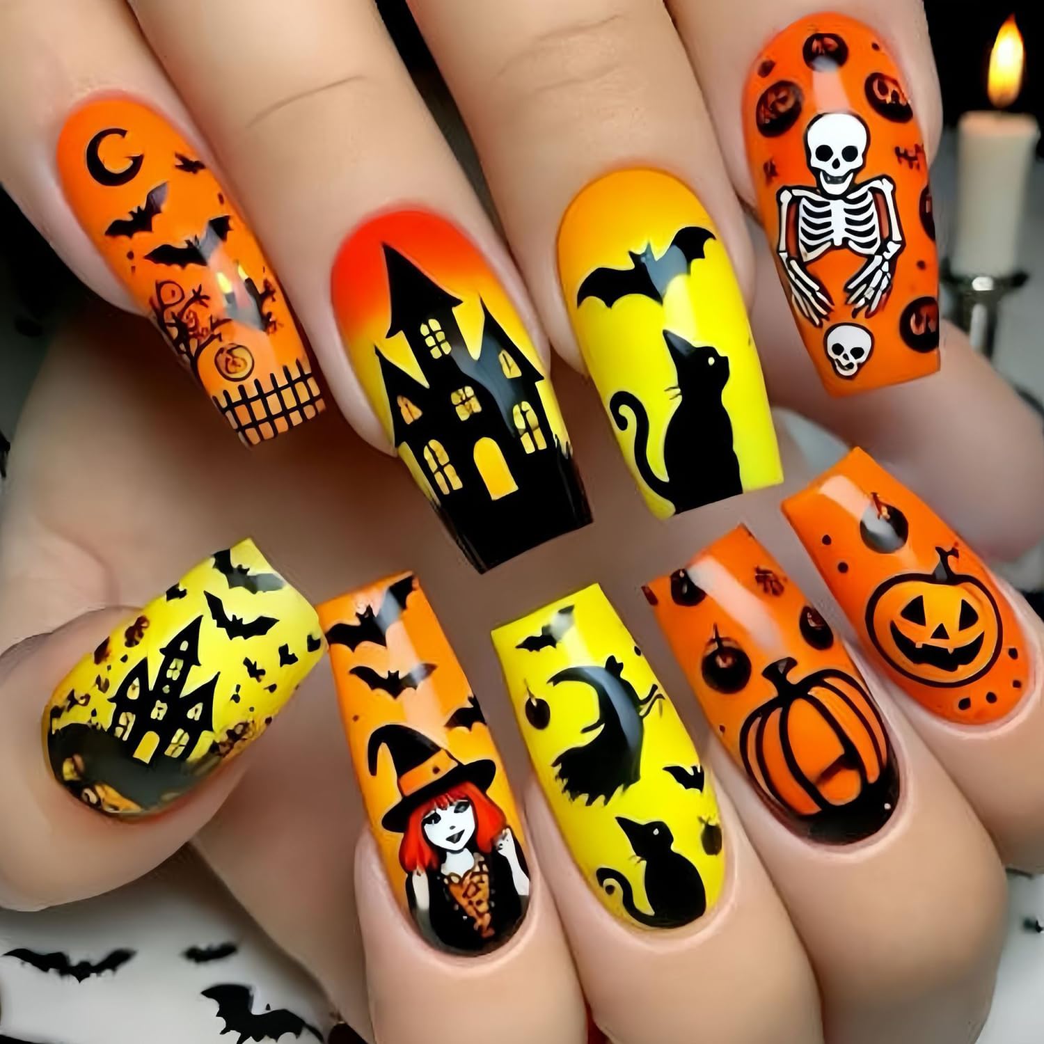 24Pcs Halloween Press on Nails Long Square Fake Nails Horror Pumpkin Acrylic Nails Eyeball Bat False Nails with Gothic Candle Desi