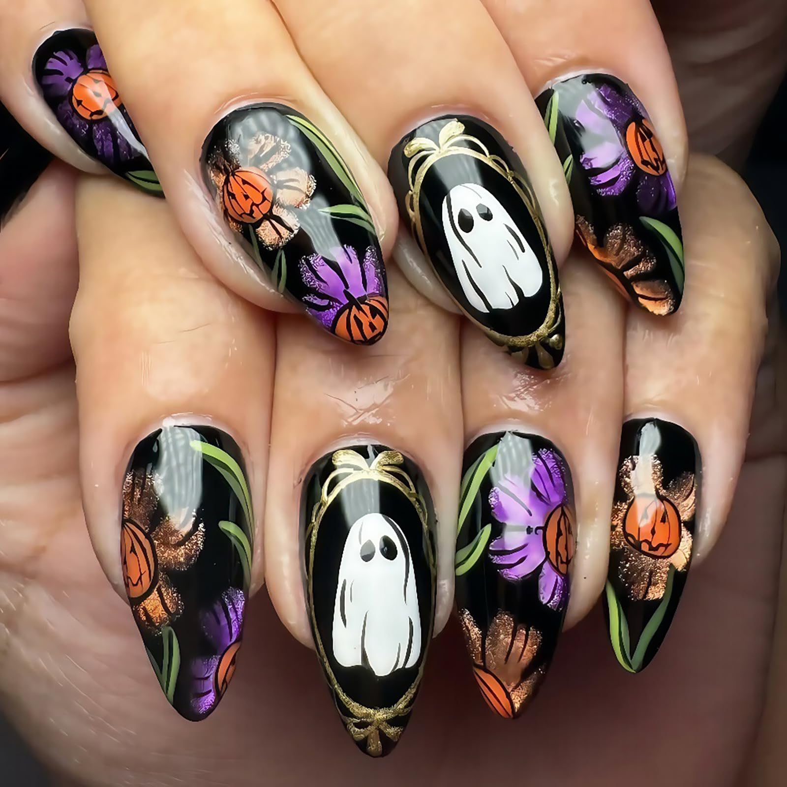24Pcs Black Almond Press on Nails Medium Fake Nails Halloween False Nails with Ghost Flower Pumpkin Design Glossy Acrylic Nails Pr