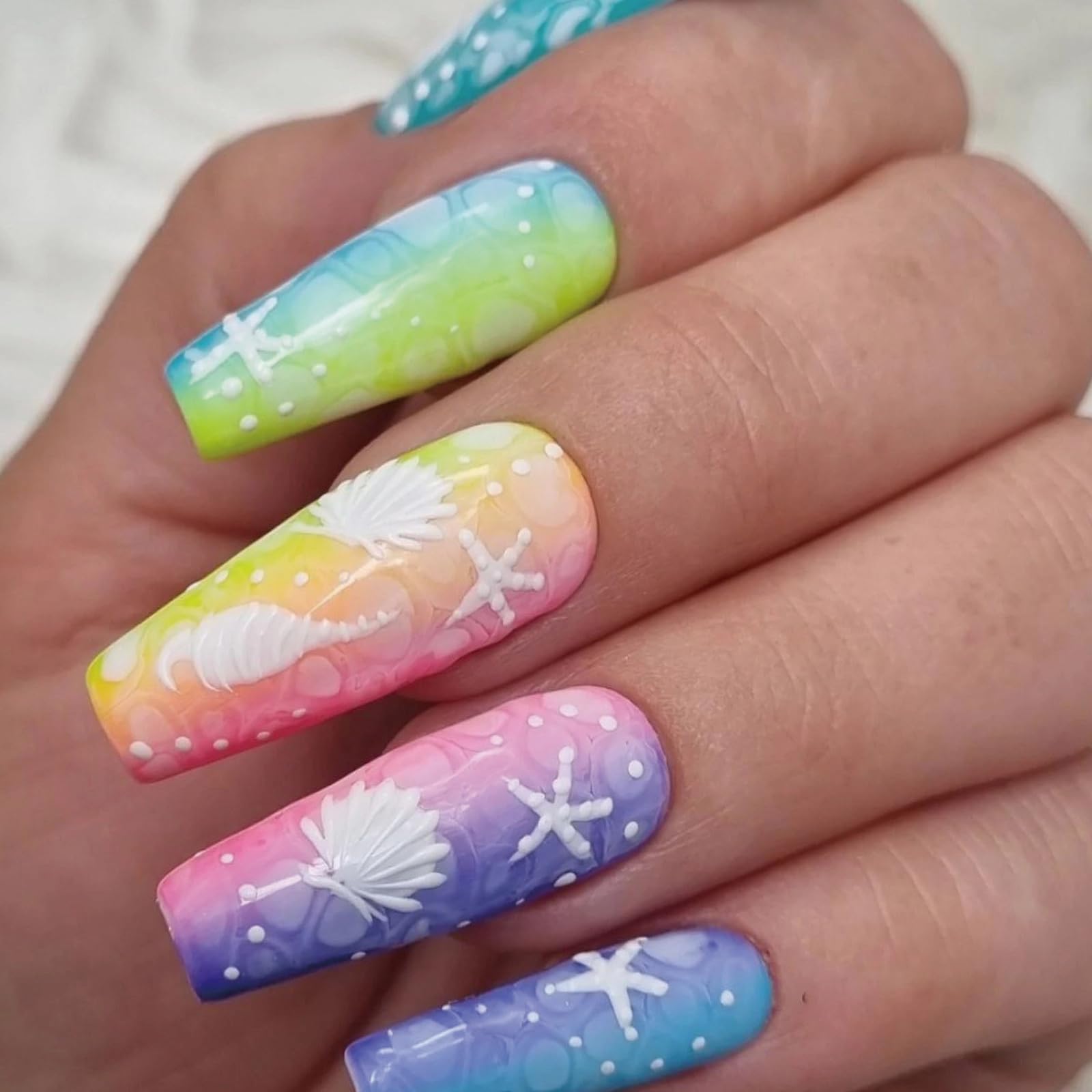 30 uñas postizas de verano a presión de almendra mediana con diseños de estrellas de mar 3D, uñas postizas de playa de verano, uña